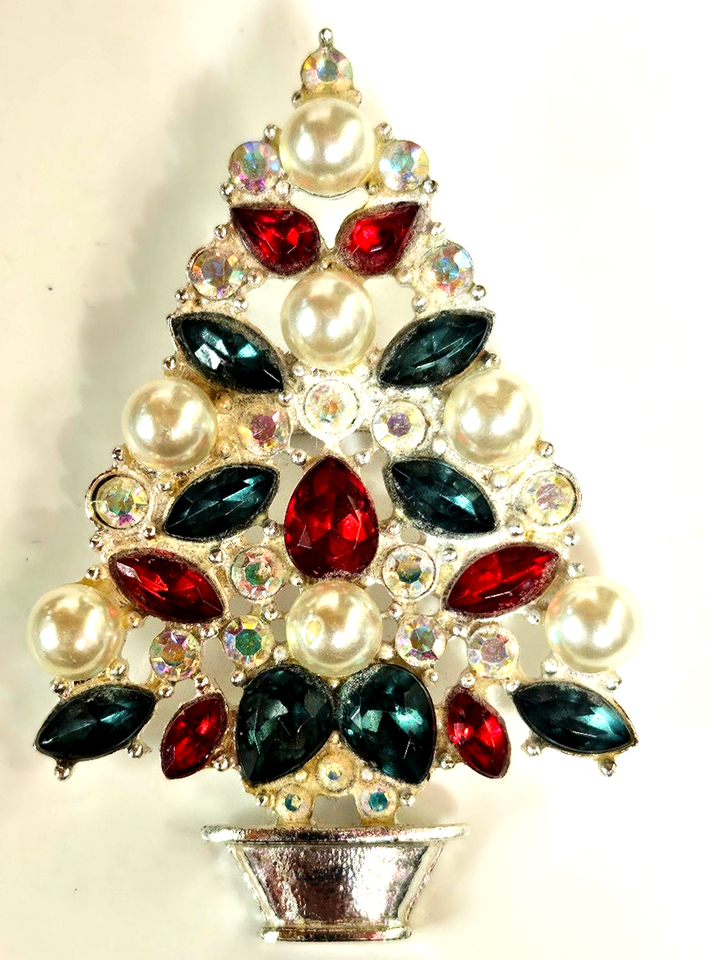 This vintage silver-tone Christmas tree brooch features multi-color rhinestones and faux pearls, measuring 2.25 inches in length. It is perfect for adding a festive touch to your holiday attire, with a vintage charm that exudes classic elegance. This fashion jewelry piece is sure to be a sparkling addition to any holiday ensemble. Whether worn on a lapel, collar, or even as a statement accessory on the shoulder, this brooch captures the whimsical and glamorous spirit of Christmas.