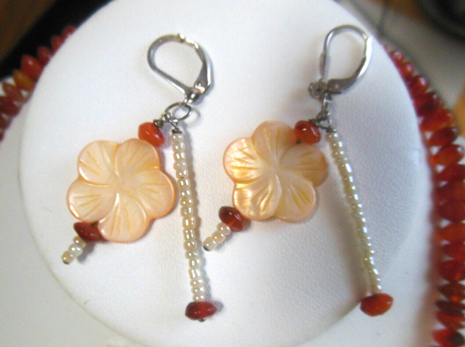 Vintage 925 Sterling Silver Amber Glass Bead Double Stand Necklace & Earring Set