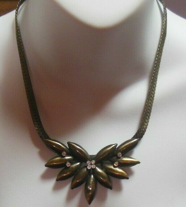 Vintage brushed Bronzy Metal Floral Rhinestone Chain Statement Necklace
