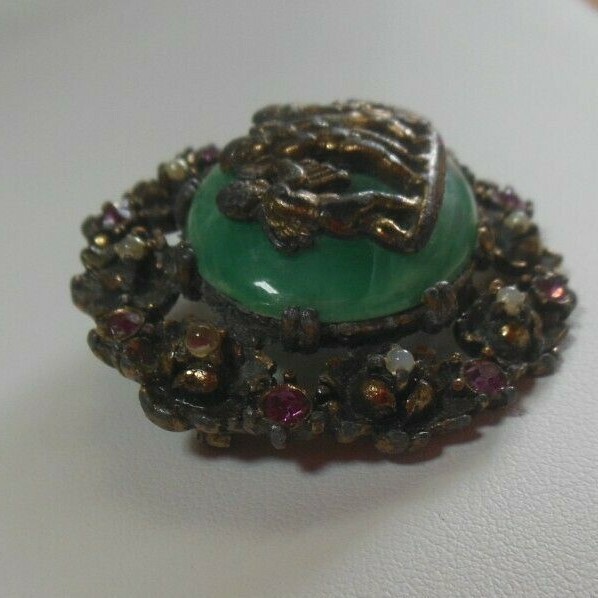 Vintage Victorian Angel Cherubs on Stone Brooch With Purple Rhinestones faux pearls that are peeling