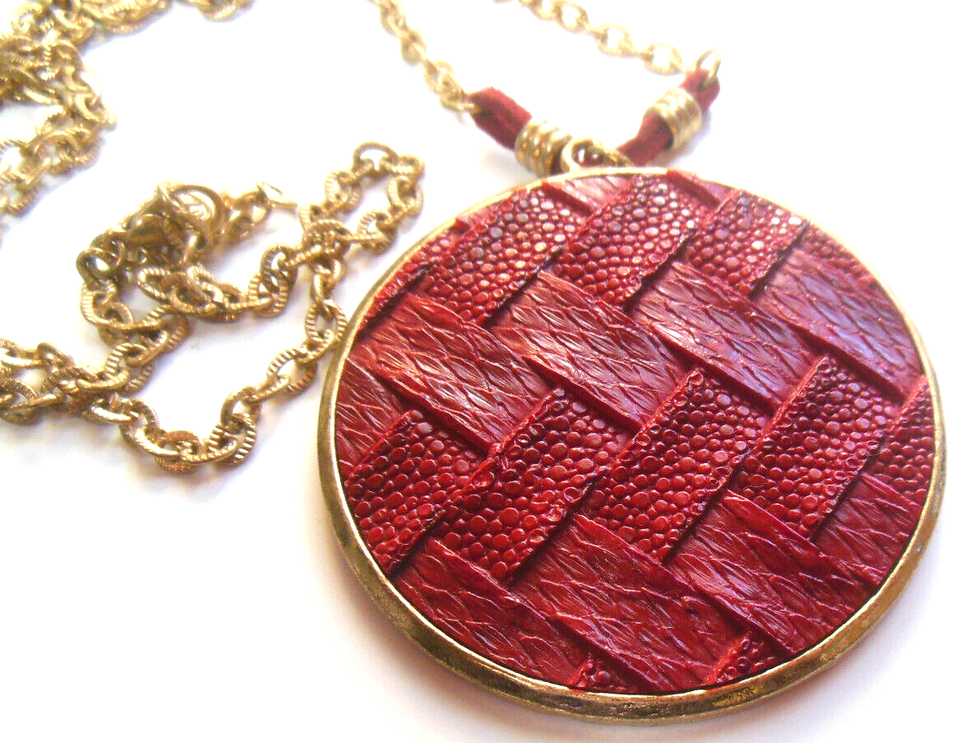 Vintage Lattice Maroon Leather Medallion Pendant Necklace Gold-tone Chain 32"