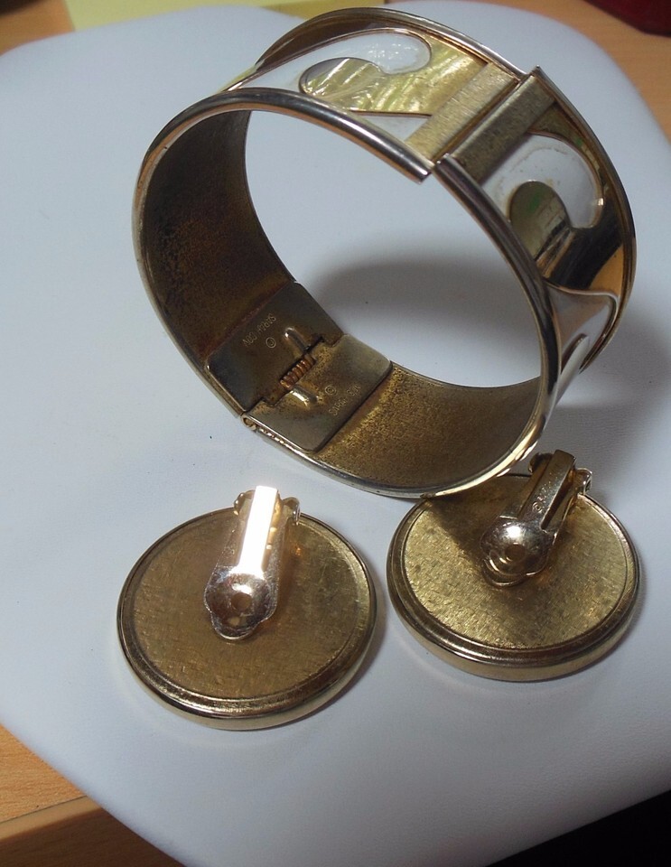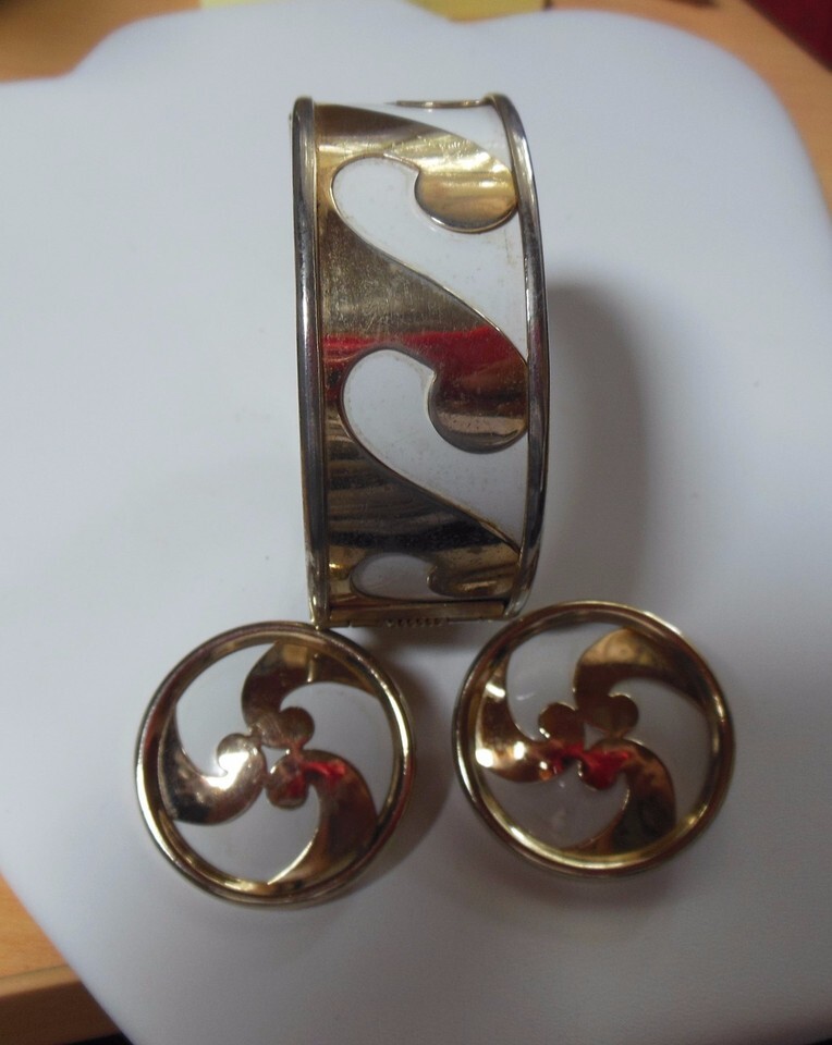 Vintage Sarah Coventry Gold Tone and white enamel Wave Hinged Bangle Bracelet Matching Clip On Earrings