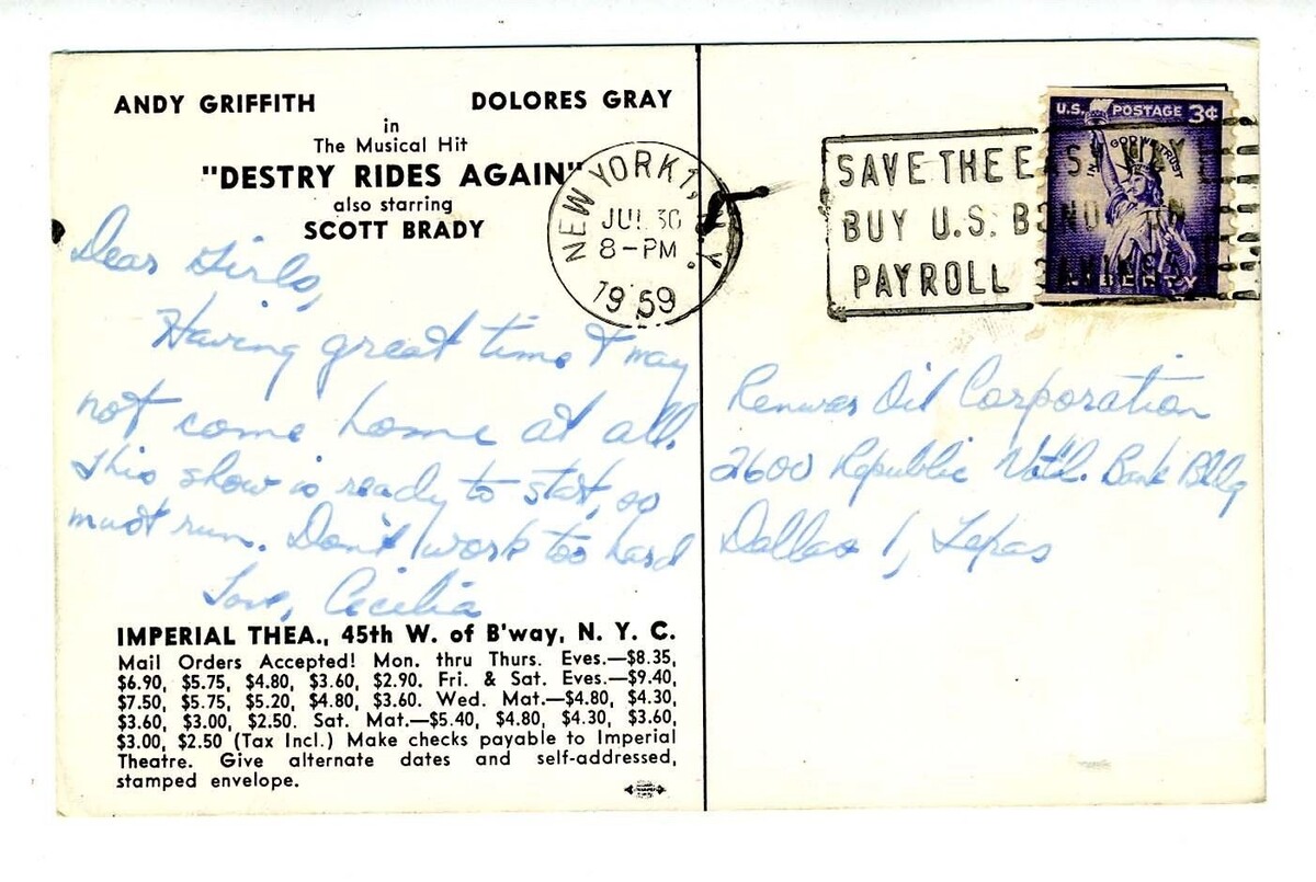 Mailed from New York City in 1959. A postcard used for advertising the Broadway Show DESTRY RIDES AGAIN starring Andy Griffith and Dolores Gray.