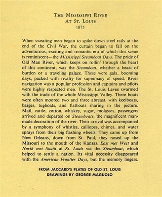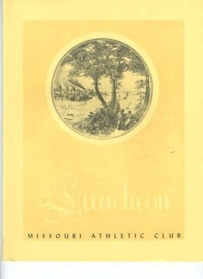 A luncheon menu from the Missouri Athletic Club in 1958. In fine condition, measures about 8 1/2" x 11" when closed. On the cover is the Mississippi River at St Louis, 1875. From Jaccard's Plates of Old St Louis Drawings by George Maguolo. With a detailed explanation on the back cover. The Missouri Athletic Club is an exclusive club formed in 1903. The Missouri Athletic Club awards the Hermann Trophy to the top male and female Division I college soccer players in the United States.
