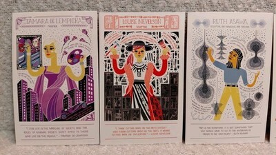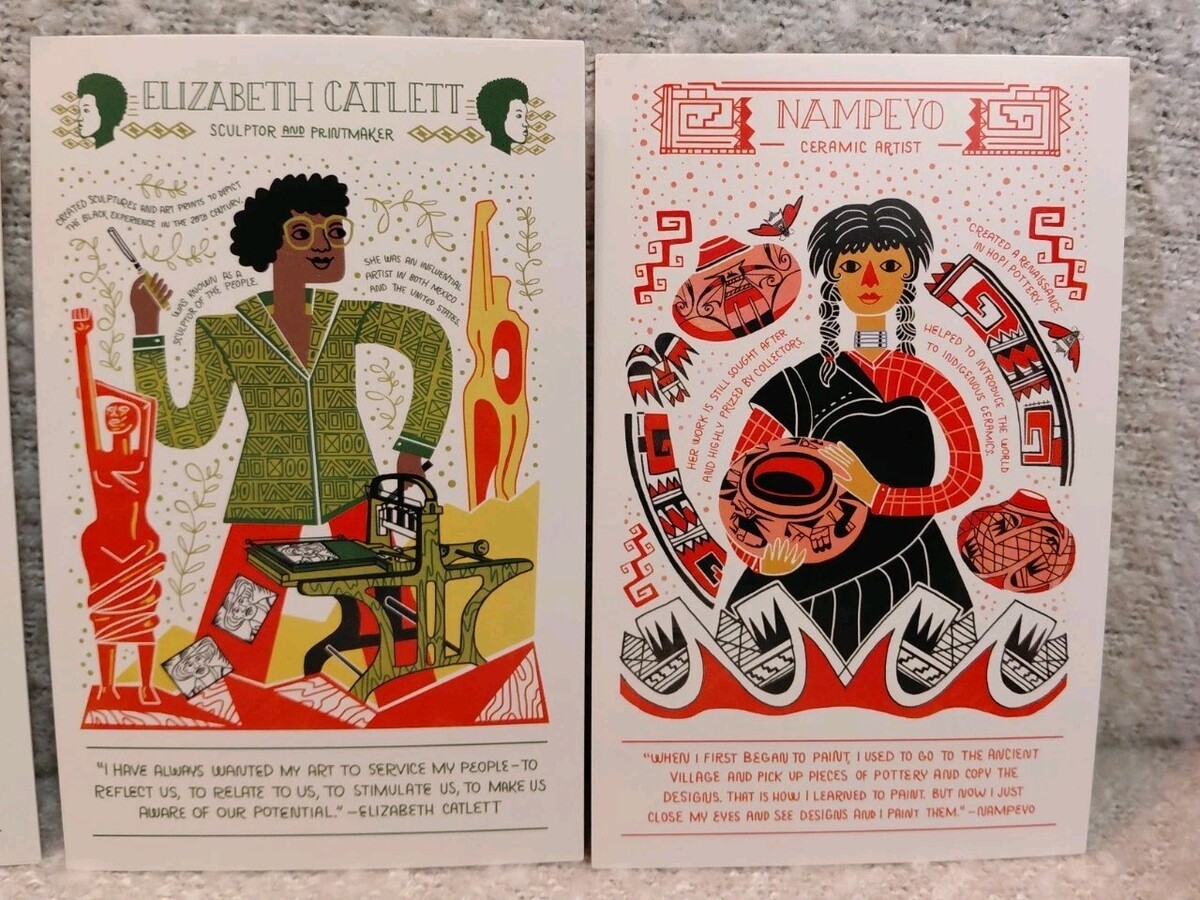 The postcards feature artwork of various notable women and showcase different characters and subjects related to women in arts, science, history, and fashion design.