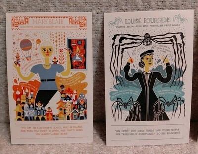 The postcards feature artwork of various notable women and showcase different characters and subjects related to women in arts, science, history, and fashion design.