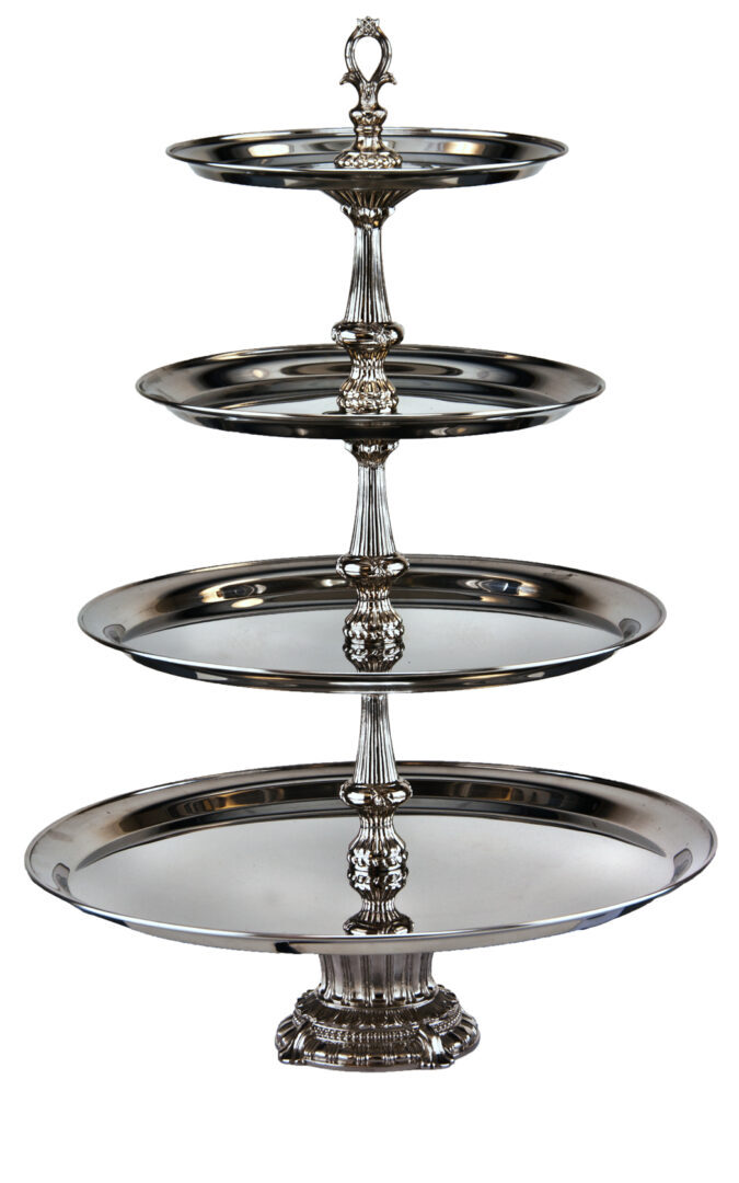 Four-Tiered Tray Display Stand Features Mirror Polished, Stainless Steel, Round Trays and Bright Nickel Plated Silver Columns and Base.