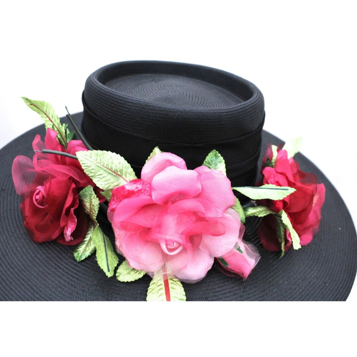 VTG 1960s Louis Original Black Straw Floral Garden Party Hat S Wide Brim