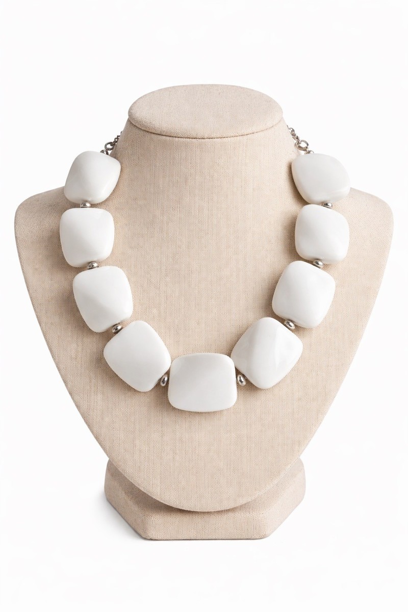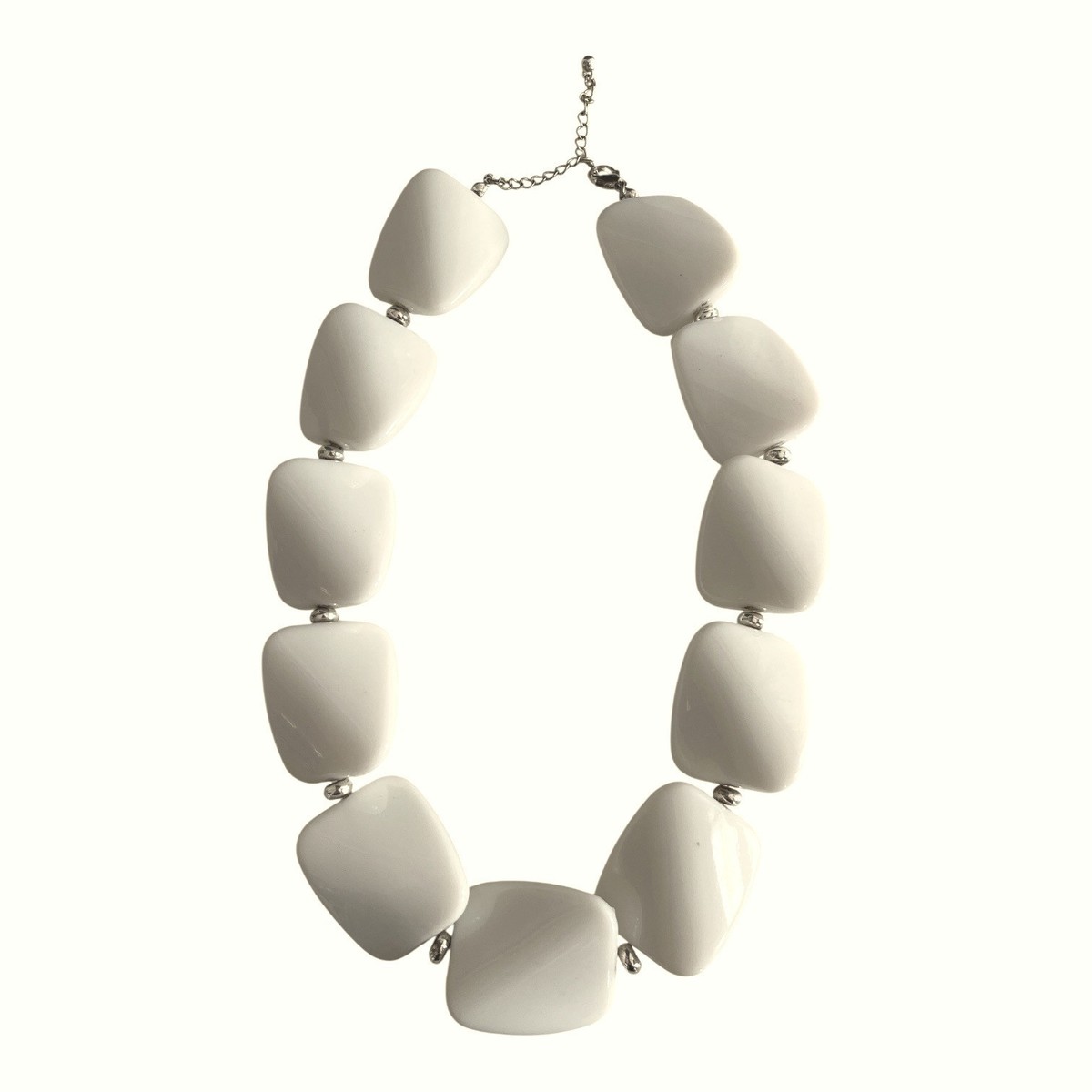 Y2K Chunky White Beaded Statement Necklace Silver Tone Clasp Retro Mod Jewelry