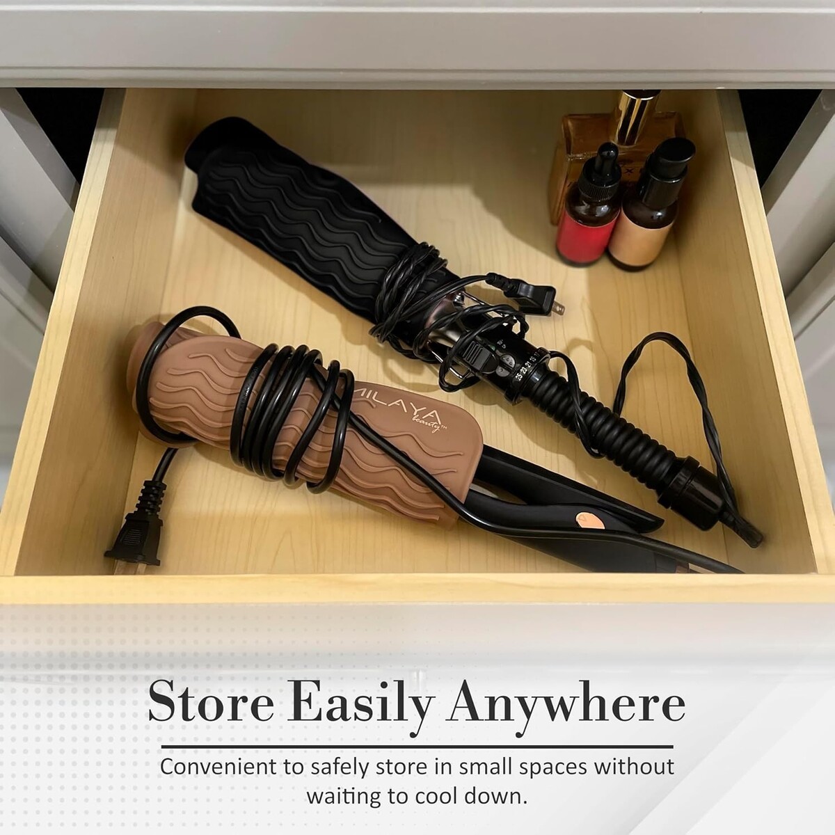 Designed for ease, our flexible vanity mat wraps securely around your curling irons or flat irons, making travel a breeze. Whether packed in your suitcase or organized in your drawer, it provides a compact and heat-safe storage solution whenever you?re on the go.