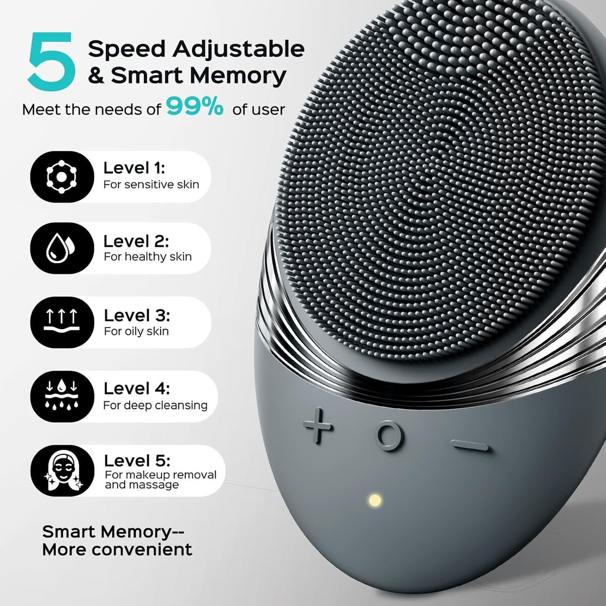 5 Cleaning Modes Smart Memory: Customize your cleansing experience with five modes suitable for all skin types, featuring a memory function for convenient one-button operation.