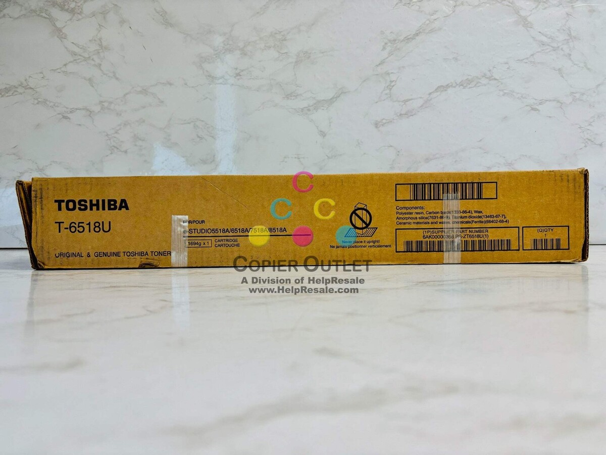 Genuine Toshiba T-6518U Black Toner New Box is damaged. Packaging shows visible wear/tear. Item inside is unaffected Please review photos carefully before purchase. For e-STUDIO 5518A,6518A,7518A,8518A Listed By: Renee (Sales Team) ?We don?t have to catch every ball that is thrown our way... Sometimes we are better off to miss a few? RRW (A positive moment brought to you by Help Resale) Copier Outlet (A Division of Help Resale) Copier Outlet was established in 1993. We buy and sell both domestically and internationally and have wide assortment of copiers, consumable and accessories of all popular brands. All of our copiers are in house and available for your inspection. They all have been tested and rated for functions, cosmetics and overall appearance. Our consumable and accessories selections include toners, imaging units, developers and copier parts such as fax board, fixing unit, fuser unit, roller, cleaning brush, drum blades and etc. For more detailed information on our copiers, consumables and accessories, please feel free to give us a call. We are more than happy to assist you with the pricing and guide you to find the copiers, consumable and accessories you wish to buy. Best Regards, Copier Outlet Sales Team Monday - Friday: 9:00 am to 5:00 pm (PST) Copier Clearance Center Promo Video - YouTube Video will open in a new windowUsing the App? Paste link into a browser window: [isdntekvideo] All product and company names are trademarksTM or registered trademarks of their respective holders. Use of them does not imply any affiliation with or endorsement by them.
