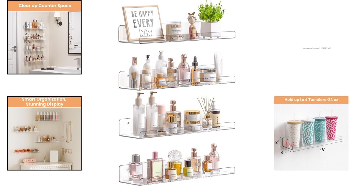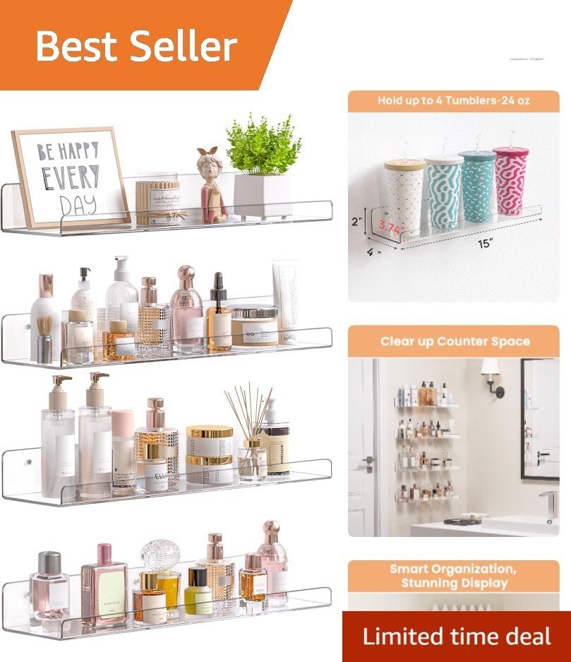Space-Saving 15” Wall-Mounted Acrylic Shelves - 4 Pack for Elegant Home Storage