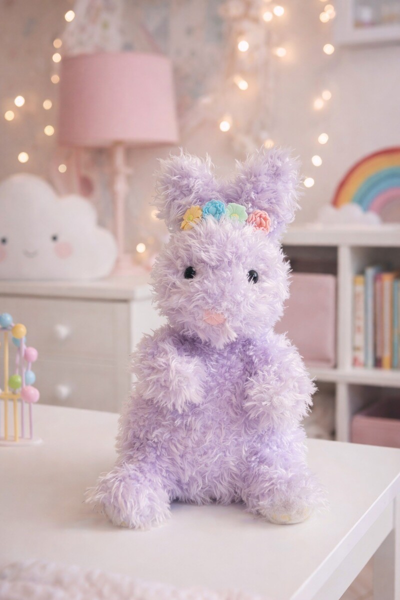 Soft lavender bunny plush from FAO Schwarz featuring fluffy fur, embroidered details, and a pastel floral crown accent. Sweet display piece or cuddle companion with whimsical character and gentle colors.