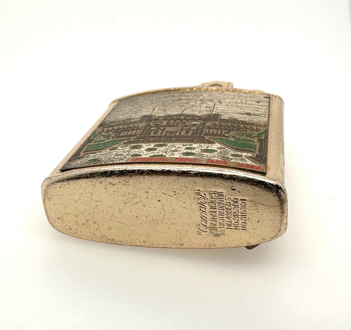 Metal lighter with painted image of the Imperial Hotel with script reading "Imperial Hotel, Tokyo Japan."