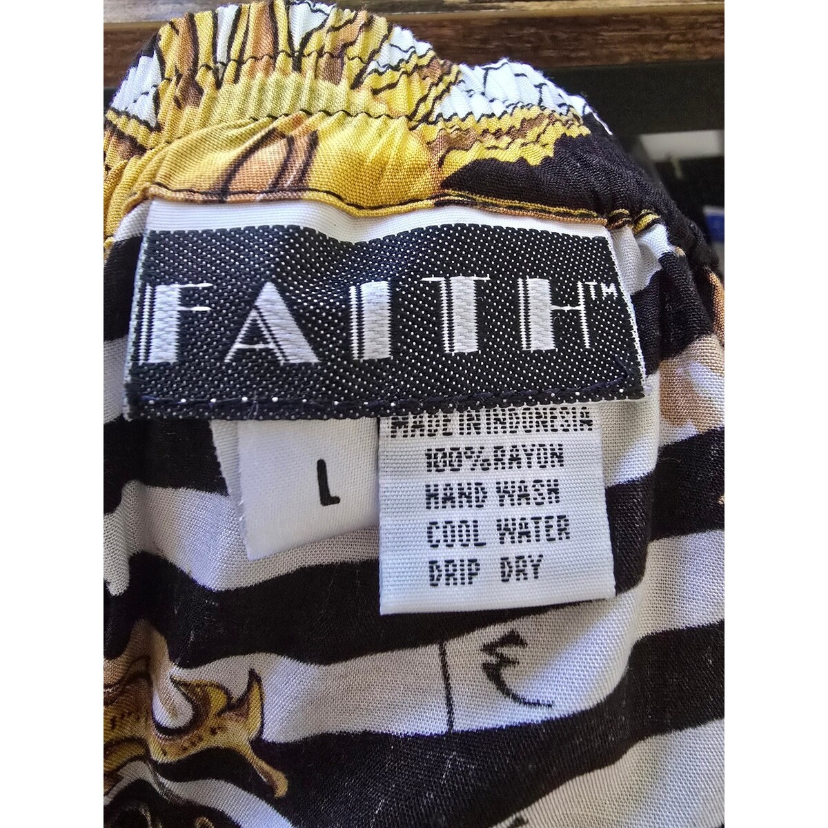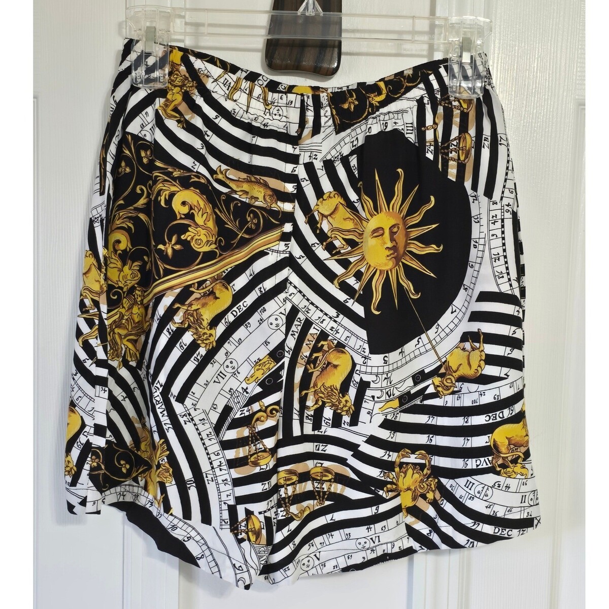 Faith brand mini skirt features a striking mixed-media design with a black and white checkered front panel and a celestial zodiac-themed back panel. Crafted from lightweight rayon, this piece showcases a bold sun face, astrological symbols, and golden accents throughout. The skirt includes a side button closure and a flattering high-waisted silhouette, perfect for making a statement.
