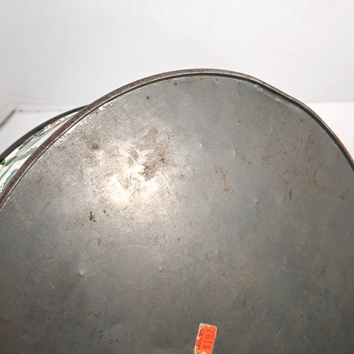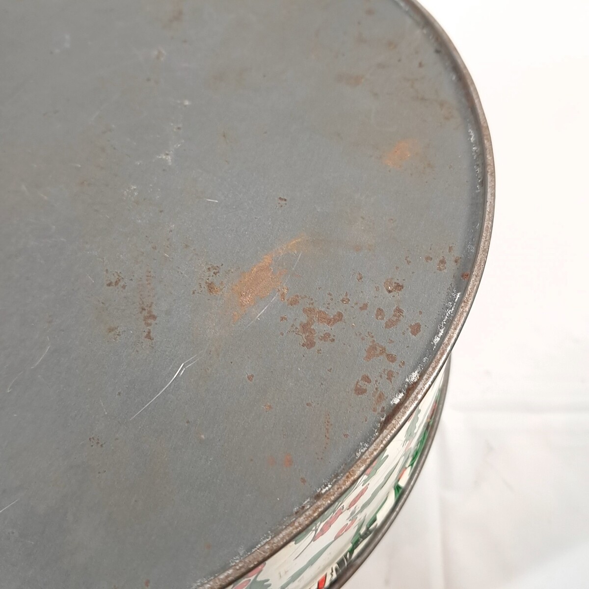 Metal tin with cute graphics of carolers/holly/mistletoe/wreath/bells in a diamond pattern.. Rust/wear/marks/dents as shown. See pics for details and measurements.