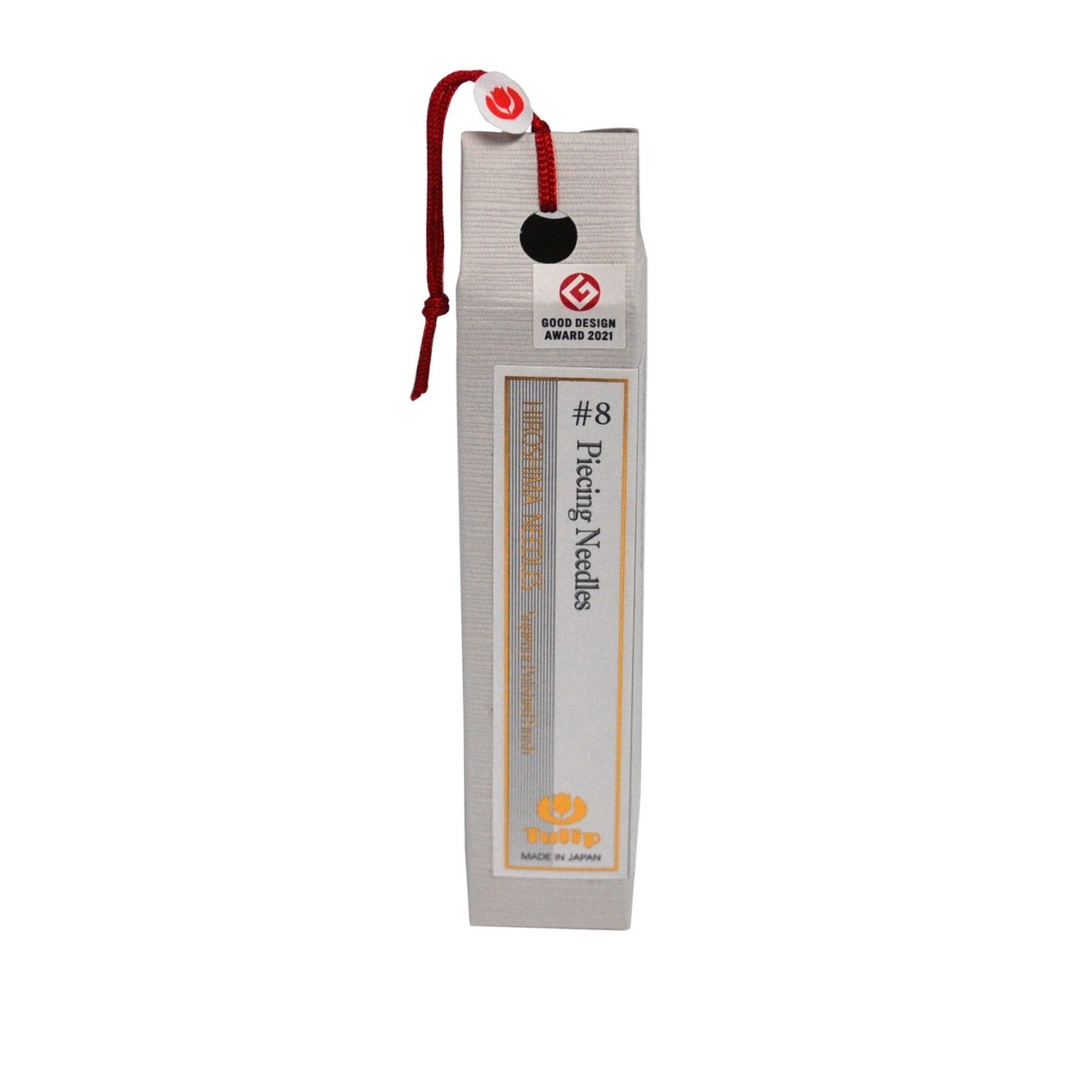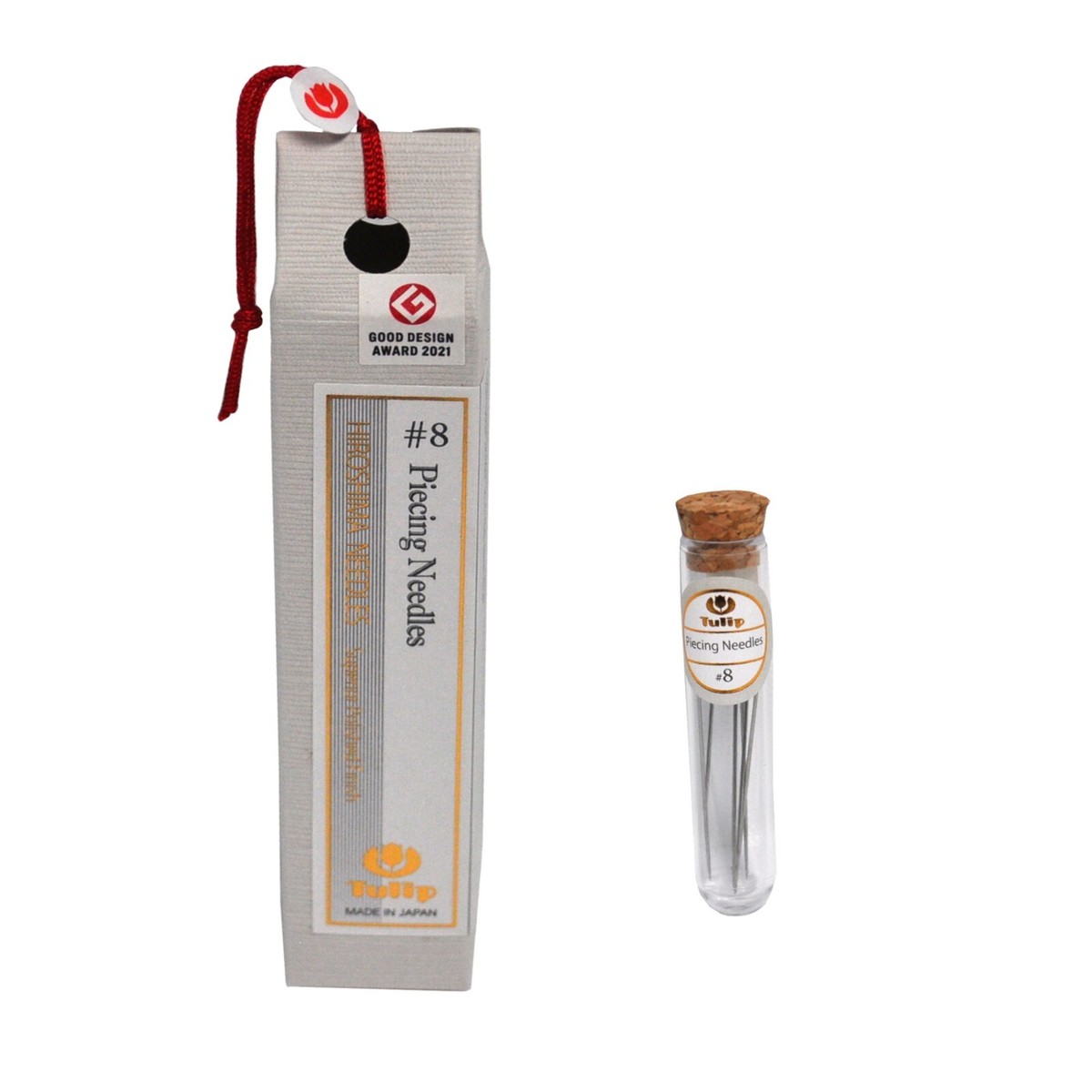Tulip Piecing Needles No 8 THN-001e. Sharp needle point with good piercing characteristics, perfect for piecing. Features: Large needle eye. Flexible and warp resistant. Runs smoothly through fabric. Superior Polished Finish. Materials: Nickel-plated carbon steel. Size: Six #8 Piecing Needles at 0.61mm x 37.0mm. Needles come in a handy carrying tube with a cork top. Art No. :THN-001e. CHK-THN-001E