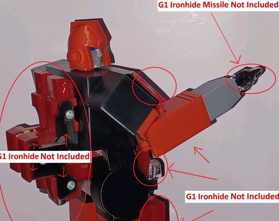 G1 Ironhide, his Gun, and his Missile are NOT INCLUDED and are used for visual and instructional reference only as stated in the pictures. This is needed so you can see him wearing the suit, the gun and missile fitting in the adapter, and how to transform and insert him as there are some differences in the way he will have to transform to wear the suit.