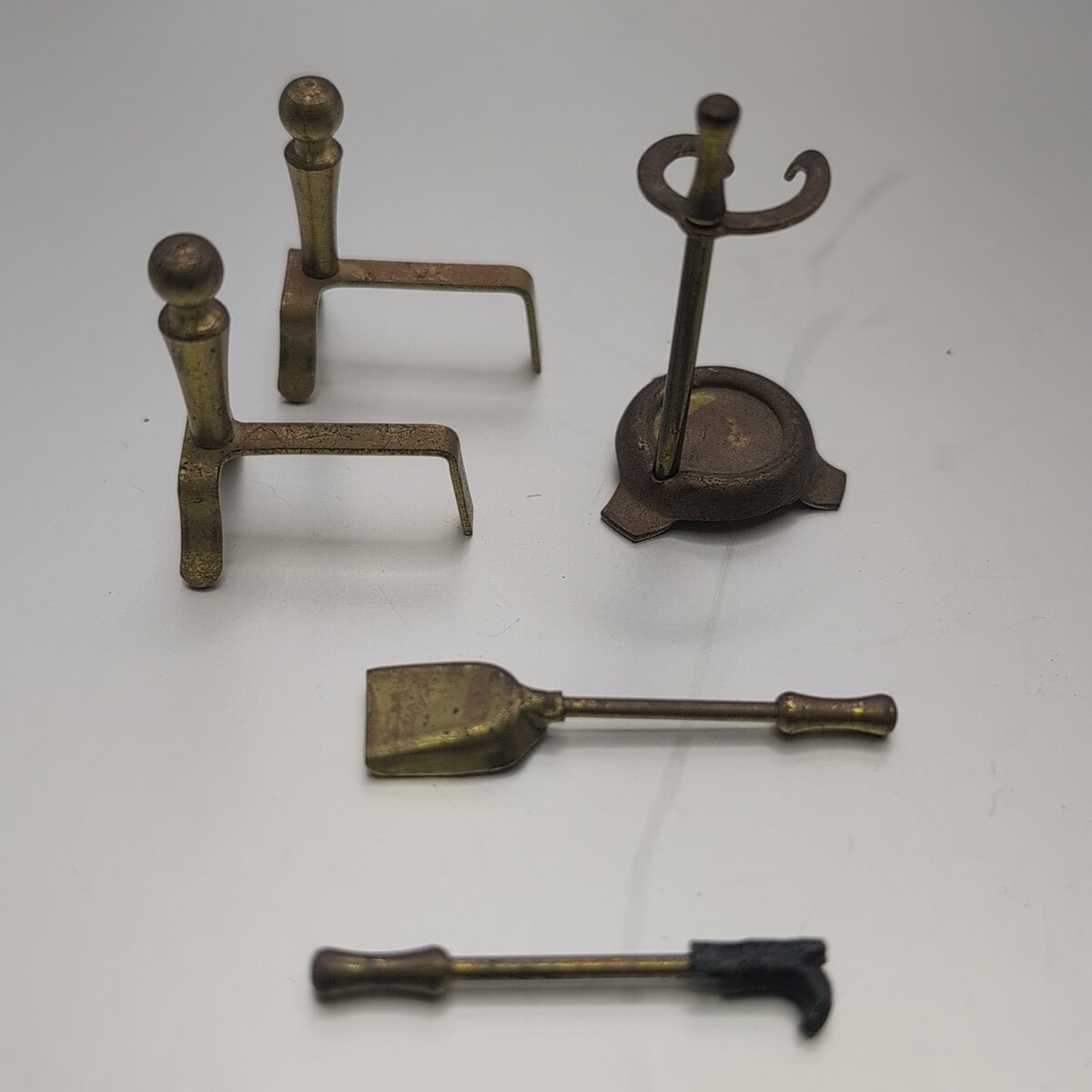 Vintage metal dollhouse set fireplace and irons and tools including poker and shovel with stand. Brass toned metal The shovel is 1 5/8 inches long as a size comparison. The andirons are 1 1/8 in tall.