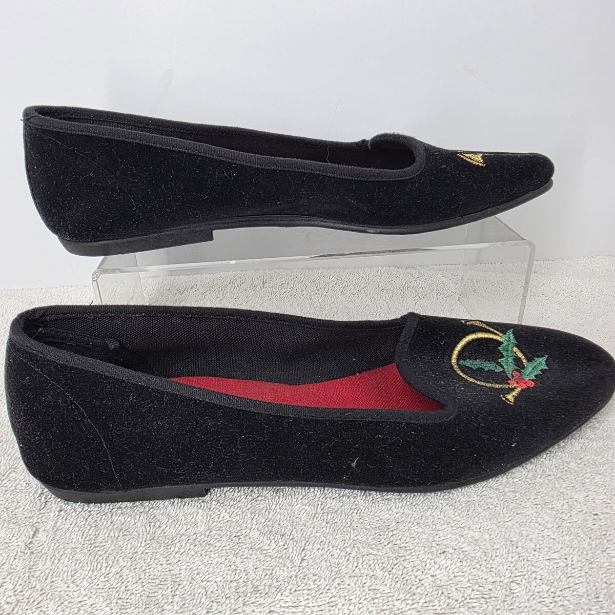 Vintage Christmas Holiday Flats Black Velvet Shoes Jingle Bells Holly SIZE 9