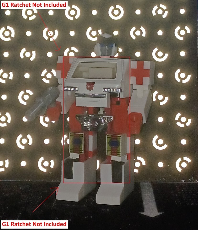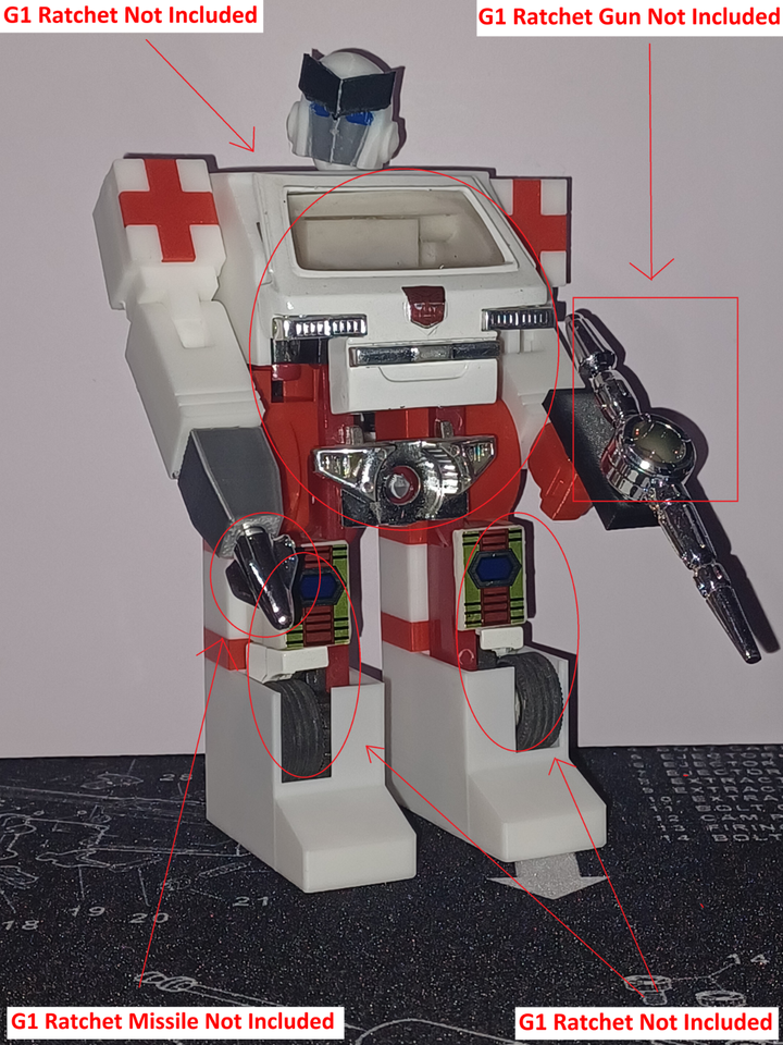 G1 Ratchet, his Gun, and his Missile are NOT INCLUDED and is used for visual and instructional reference only as stated in the pictures. This is needed so you can see him wearing the suit, the gun and missile fitting in the adapter, and how to transform and insert him as there are some differences in the way he will have to transform to wear the suit.