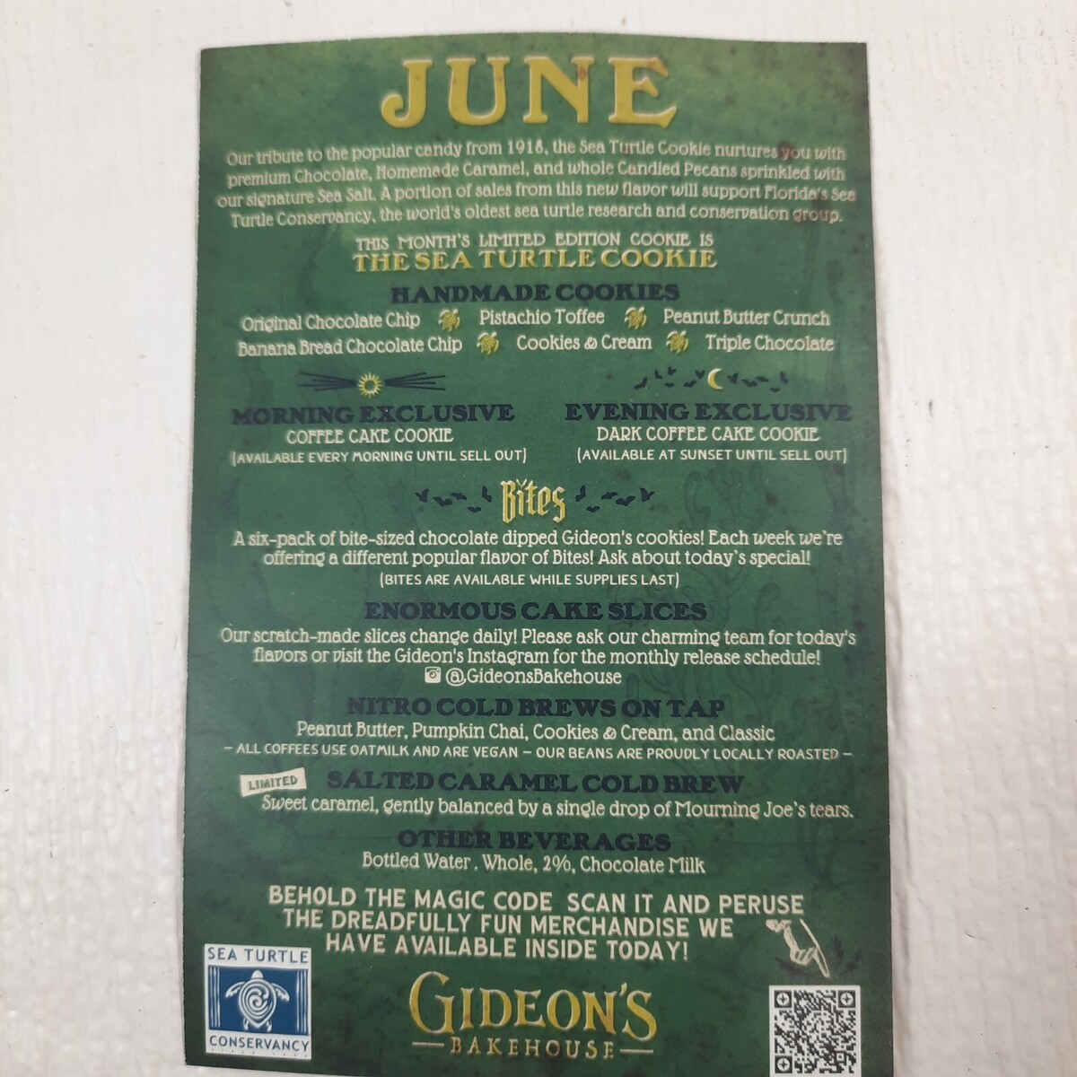 Gideon's Bakehouse Menu card June 2023 Reginald Ridley Sea Turtle Disney Springs