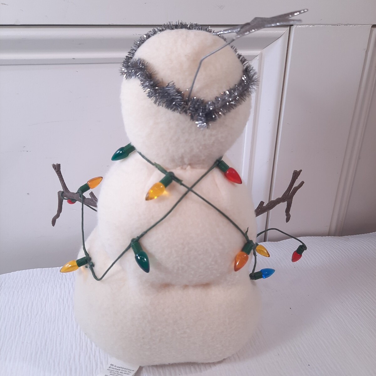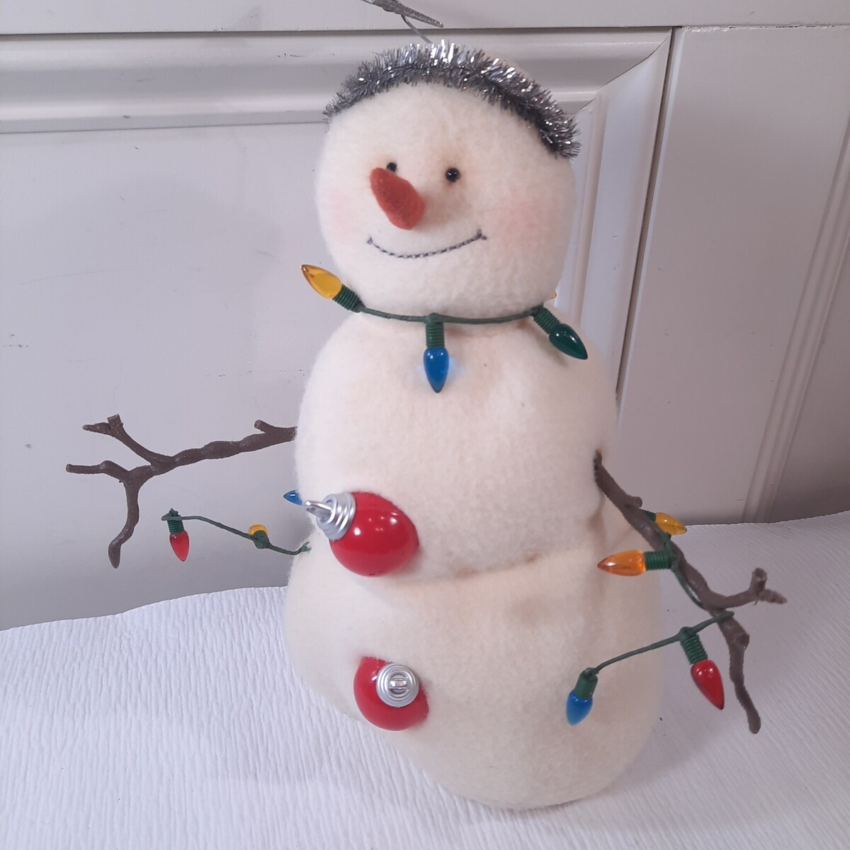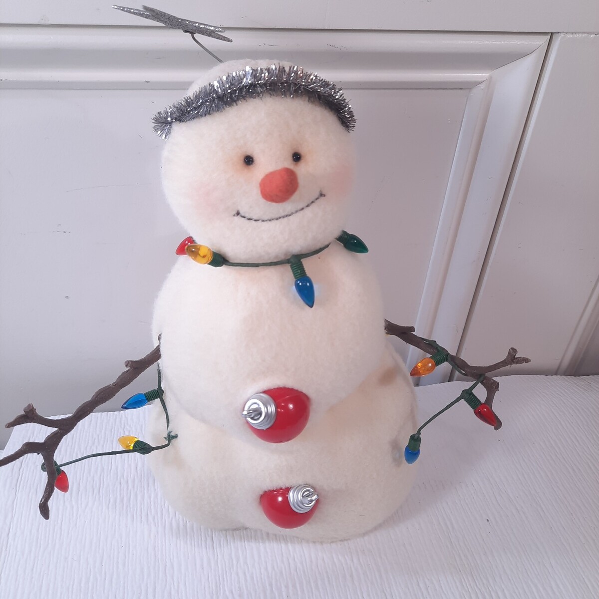 Soft sculpture snowman with string of lights around the body, ornaments as the buttons, and a star halo. Very good condition.