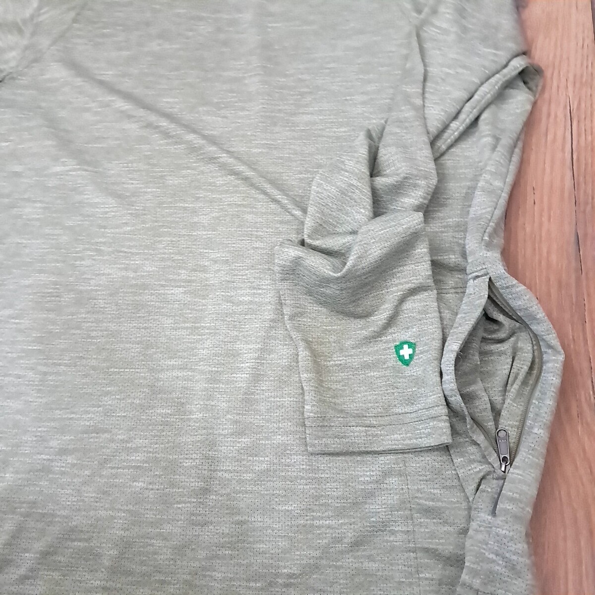 Lightweight tight night mesh. Heathered dusky green. zippered pocket on side.