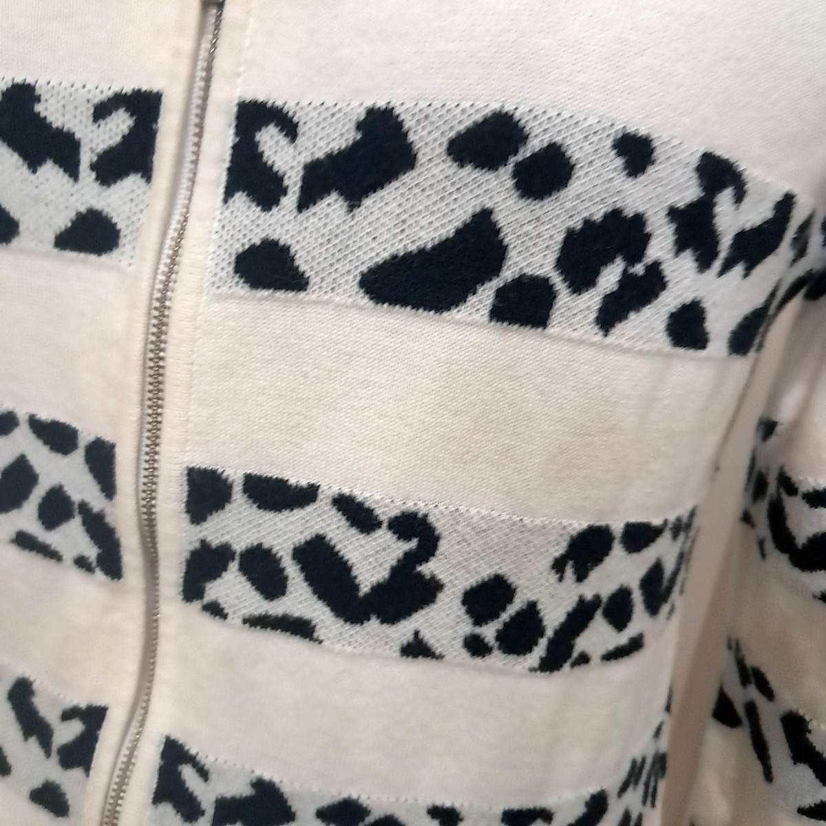Cream with black spots and stripes. Zippered style. Snug fit. Excellent condition. See pics for measurements and details.