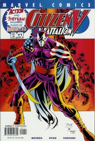*Script by Fabian Nicieza. Pencils by Michael Ryan. Inks by Sean Parsons./ Following the remarkable events of Thunderbolts #50, the V-Battalion is determined to track down the mastermind behind the nanoprobes technology. And the first step is sending Citizen V (aka John Watkins III) to acquire a top secret Voice Modulation Program (VMP) from a research facility in Atlanta! However someone else gets the software program first: Diamondback! Whoa, how is Captain America's former partner (and girlfriend) involved in this? Citizen V doesn't know, but he follows Rachel Leighton to Brooklyn...and watches her give the VMP to Fenris -- the von Strucker twins! Oh no, that can't be good! So Citizen V tries to stop the transaction, but the mind-controlled Diamondback blocks him! And Fenris escapes! But wherever the twins go, the V-Battalion will follow! Cameo appearances by Andrea Sterman and Modok. V-Battalion Roster: Roger Aubrey (aka Destroyer), Fred Davis, Goldfire, Iron Cross, Isadora Martinez, Nuklo, Elisabeth Barstow (aka Silver Scorpion), and Topspin.