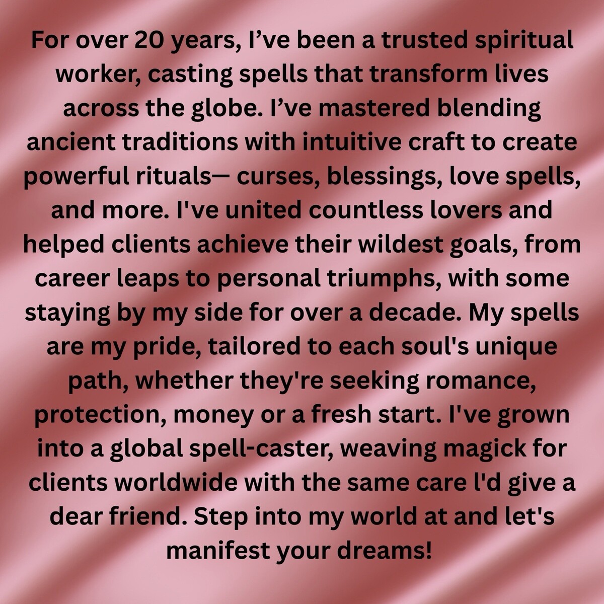? Since 2005, Enchanted Magnolia has been assisting clients with manifestations. As authentic practitioners of both light and dark magickal arts, including spells, spirit summoning, and spiritual guidance, we have served diverse clients, including government officials, celebrities, models, and individuals from all walks of life.