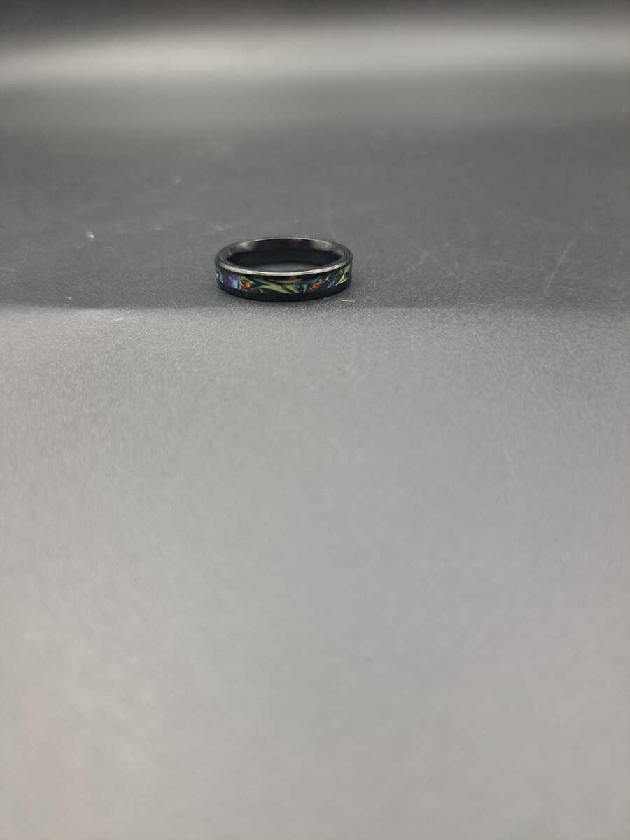 ~ A size 6 ring that is black with blues, greens, and yellows in the middle. It weighs about .04 ounces.