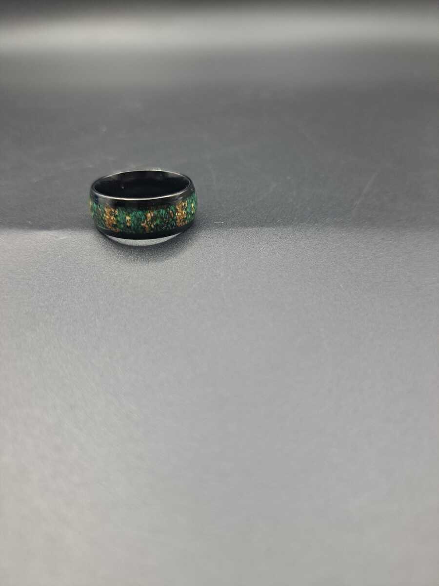 ~ A size 7 1/4 ring that is black with yellow and green in the middle. It weighs about.11 ounces.