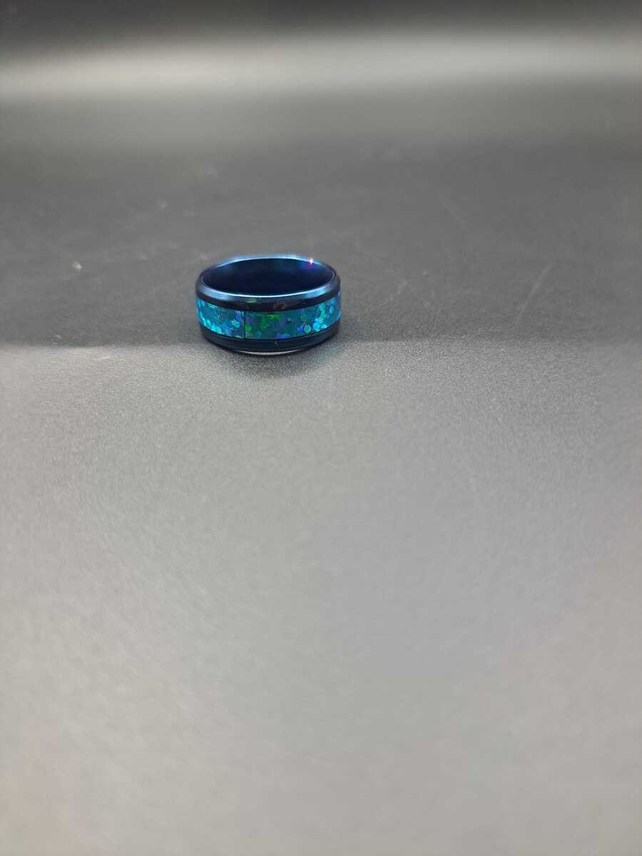 ~ A size 7 ring that is blue with a sparkle blue middle. It weighs about .11 ounces.