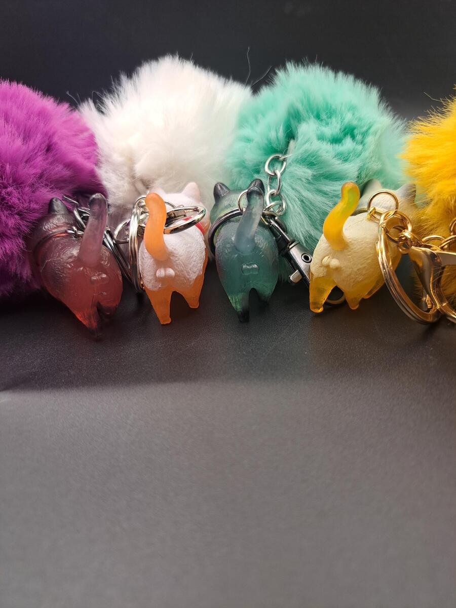 = Keychains are about 5 inches from the top of the clip to the bottom of the poof ball.