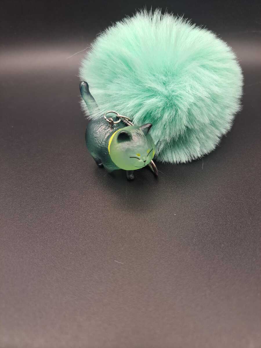 ~ 4 is a green cat with a teal puff ball and black and silver hardware.