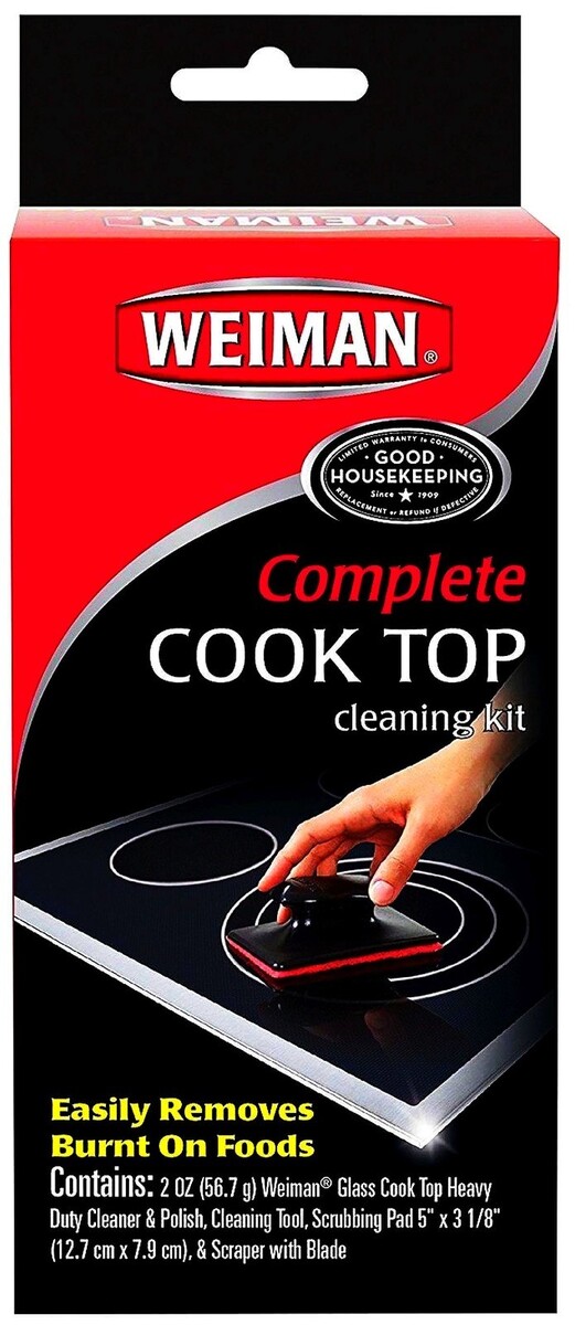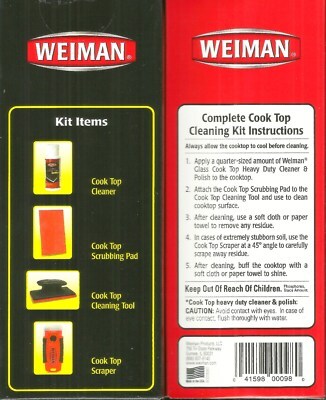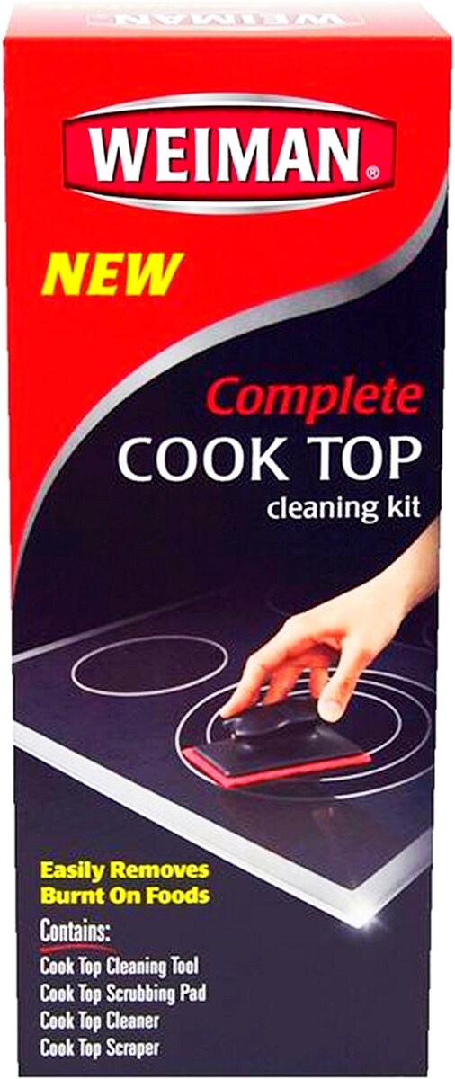 note... this weiman complete cook top cleaning kit contains a bottle of weiman cook top cleaner, a cook top scrubbing pad, cook top cleaning tool for use with your scrub pad, and a cook top scraper for the really tough burnt on foods.