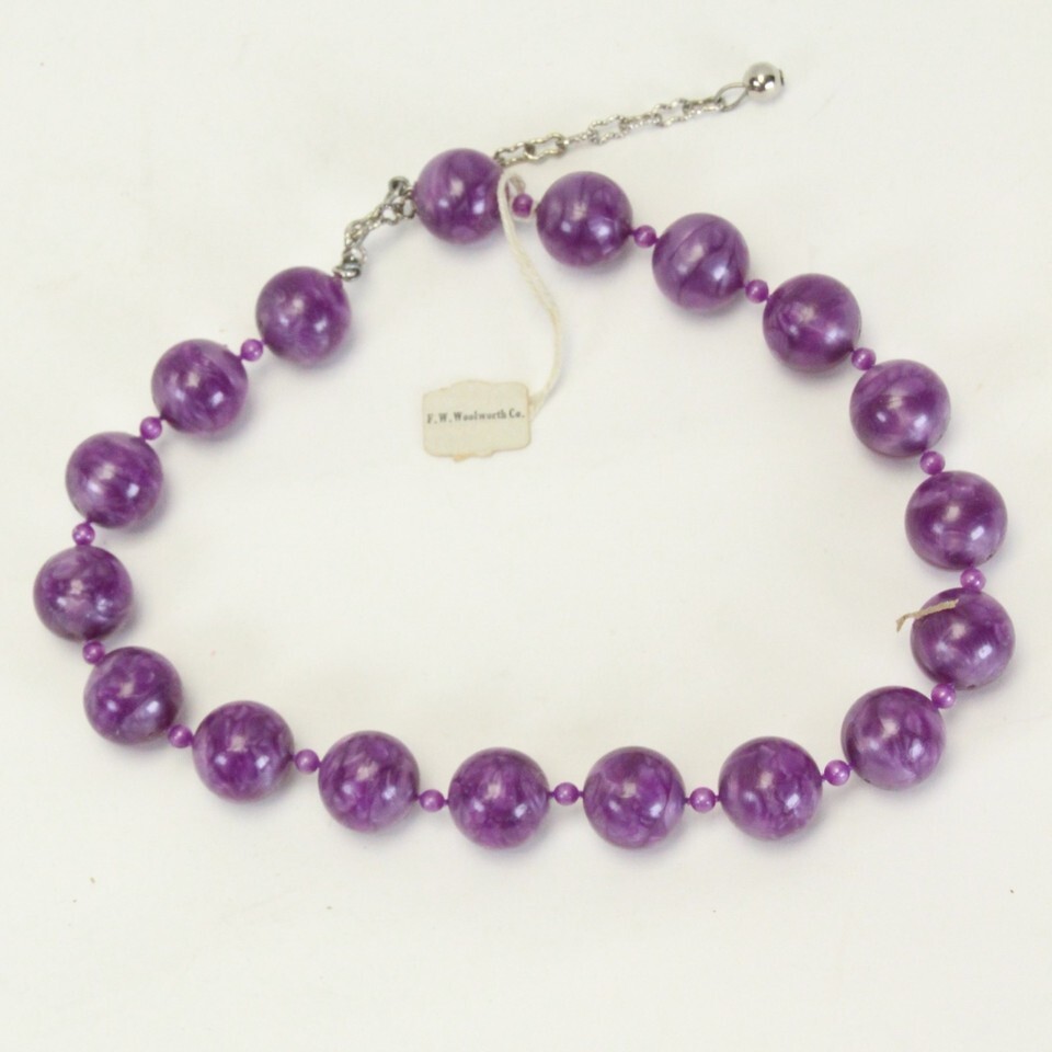 Marbled Purple Beaded Necklace w/ F.W. Woolworth Co. Tag 18" Long 0.6' Beads