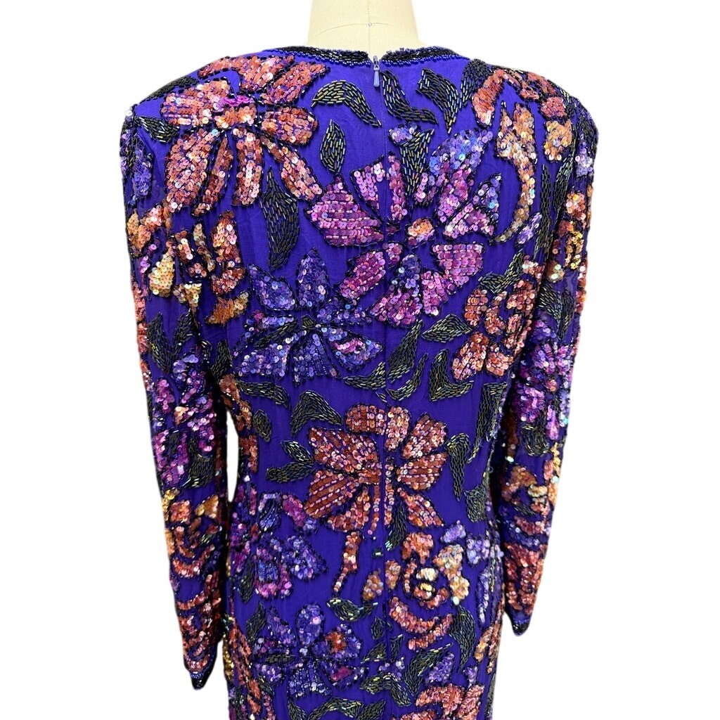 VTG 1980s Oleg Cassini Purple Beaded Silk Dress Power Shoulder Glam 6/S