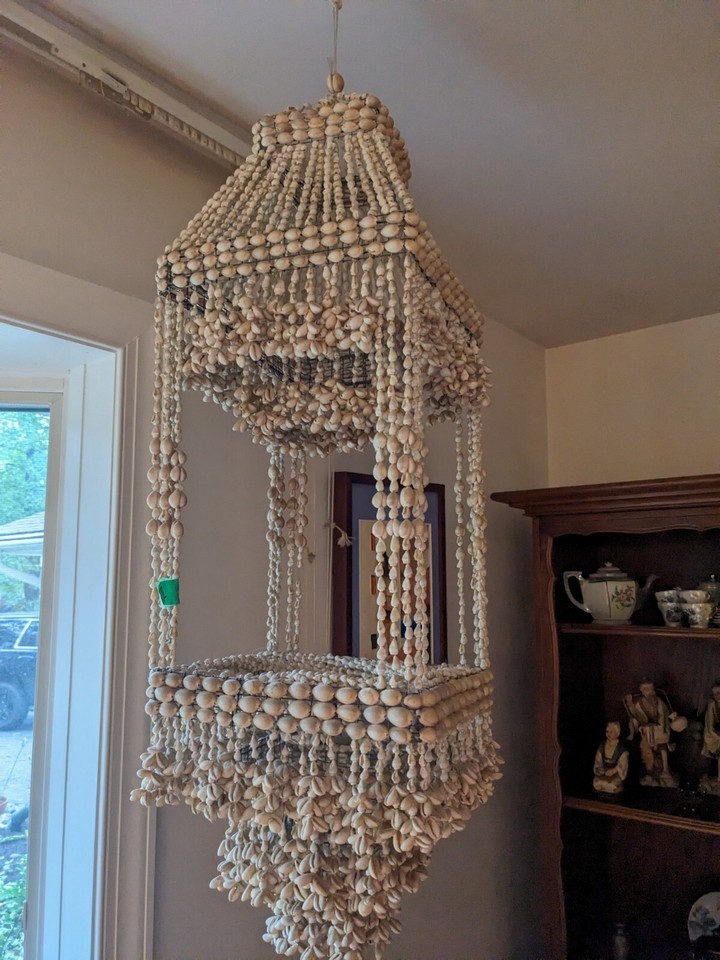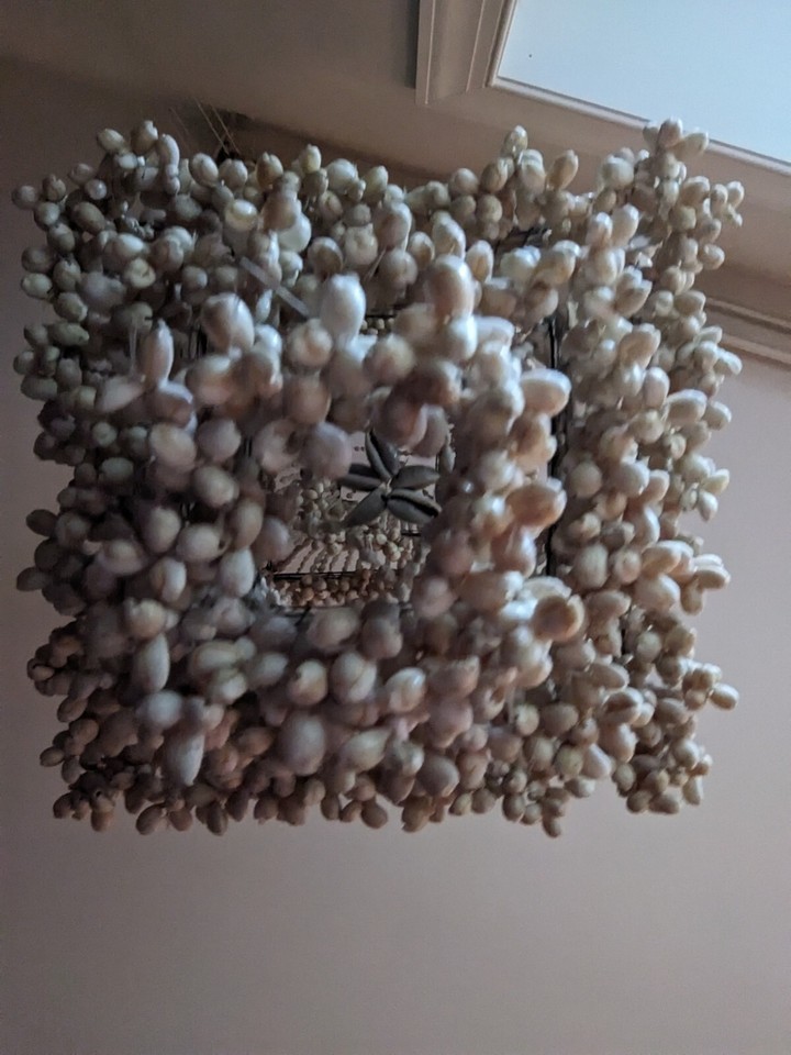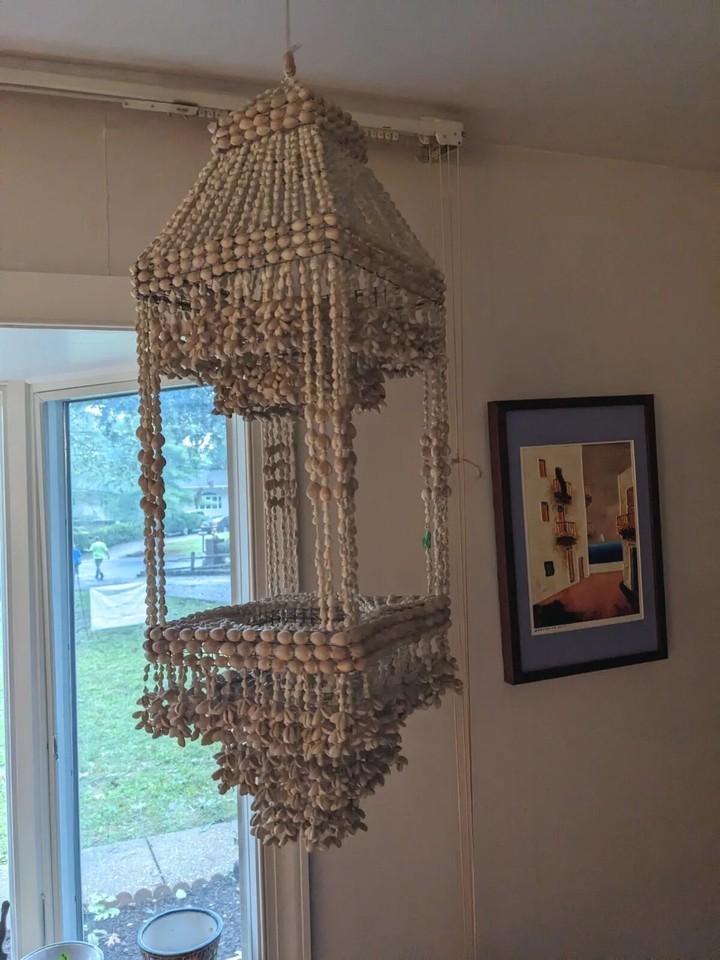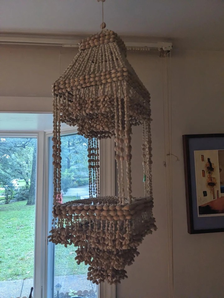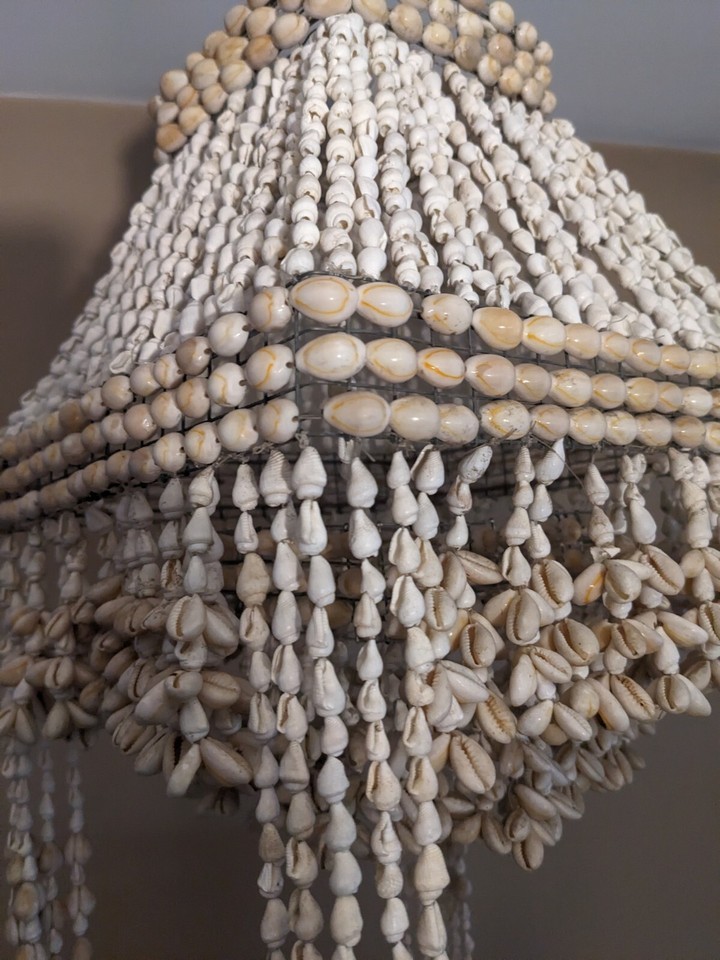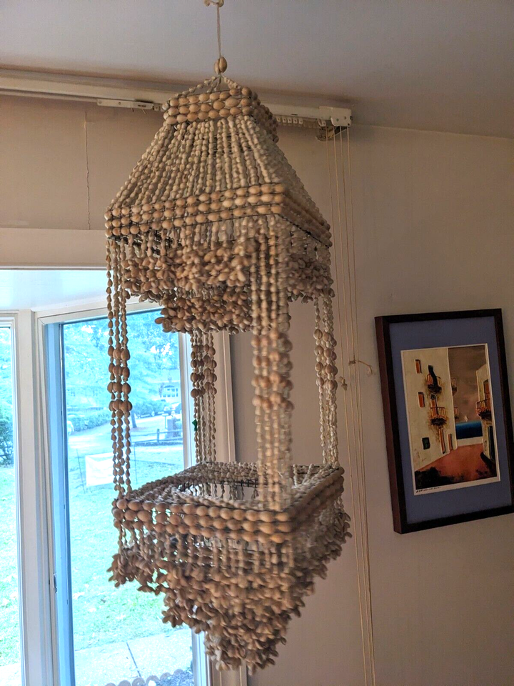 1970s Cowrie Shell Macrame Hanging Chandelier Plant Holder Boho 40 Inch Tall