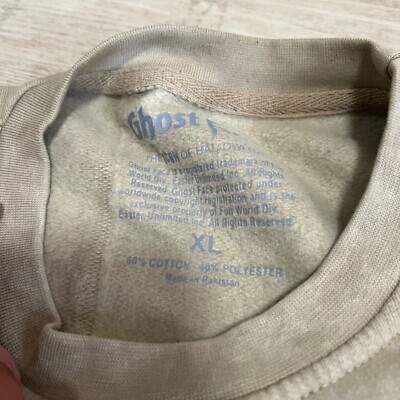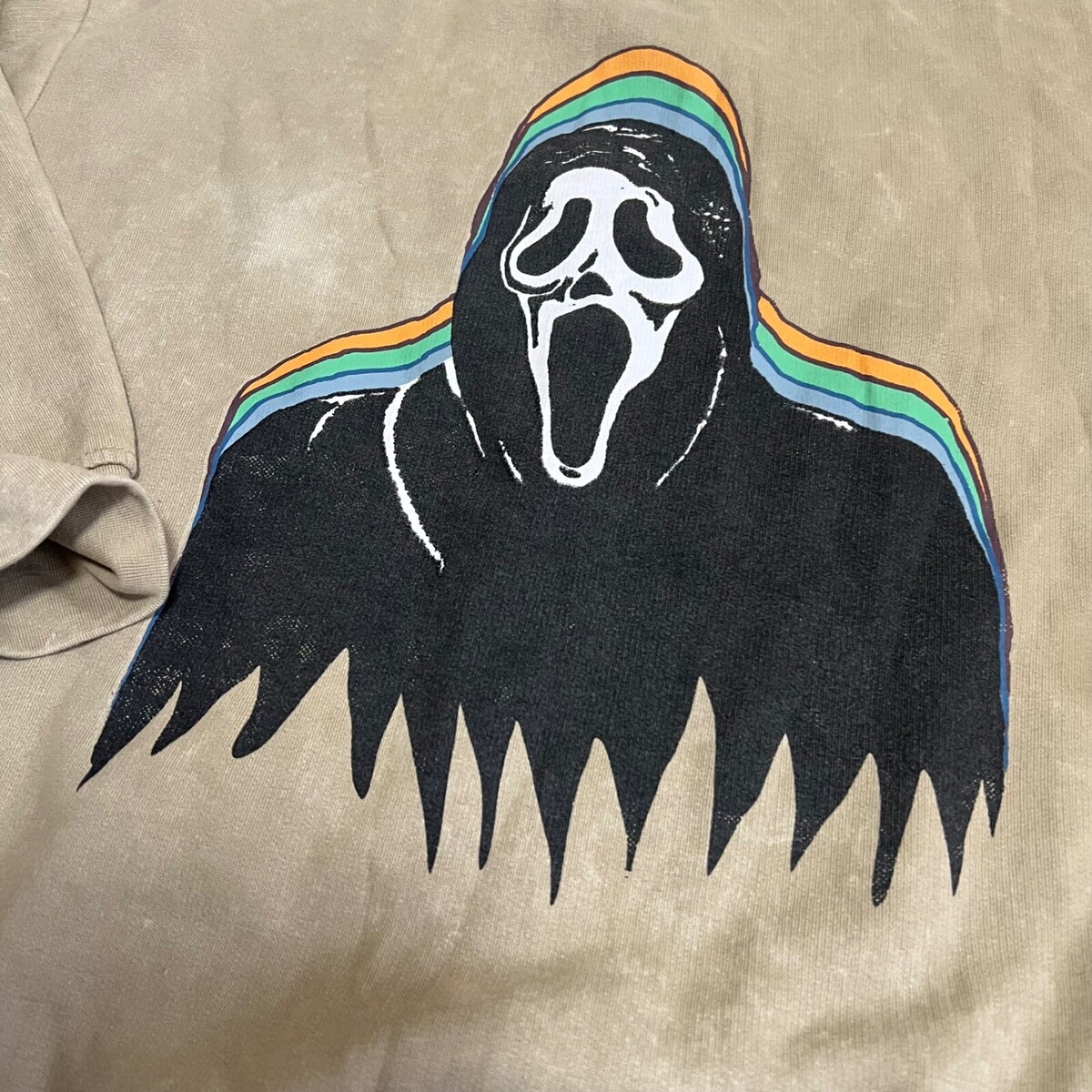 Unleash spooky vibes with this eye-catching Ghost Face sweatshirt! The unique design features the iconic Ghost Face graphic, accented with a vibrant rainbow trim that adds a playful twist to the classic horror image. The neutral beige color provides a versatile backdrop, making the graphic pop. Imagine the soft, comfortable feel of this sweatshirt as you settle in for a scary movie night, or picture yourself turning heads at a Halloween party. This sweatshirt is perfect for casual outings, themed events, or simply lounging at home in style.