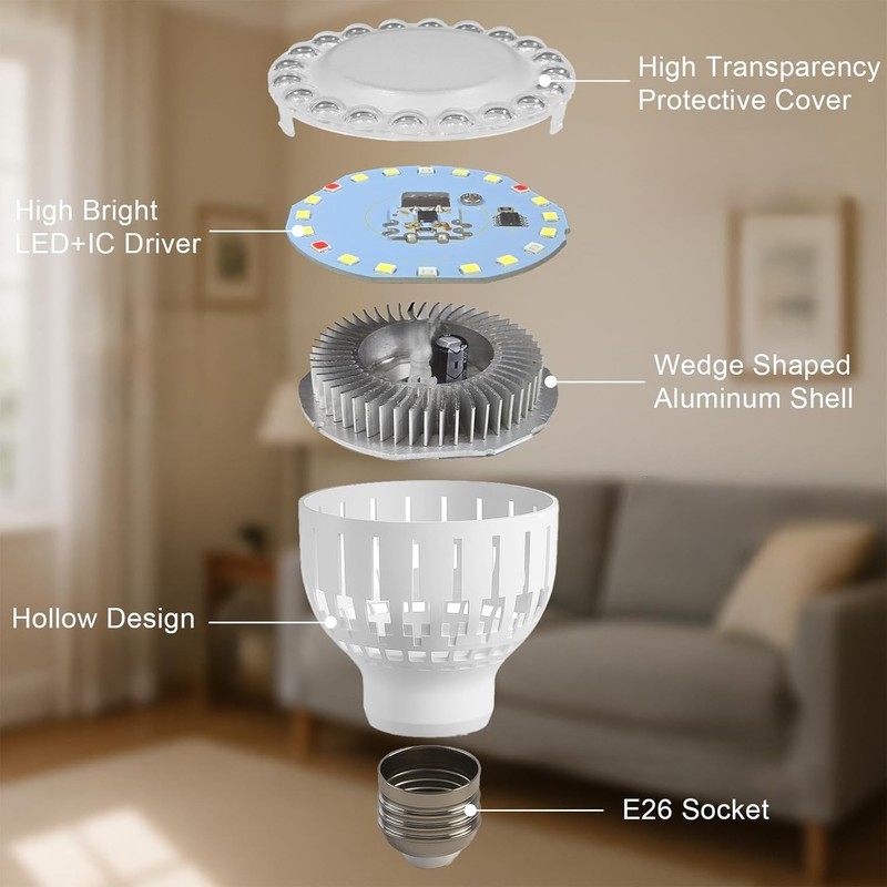 RELIABLE with Scientific Internal Design - built in hollow cylindrical aluminum heat sink, the aluminum shell is a very good and safe heat dissipation material, and the hollow design allows for a heat dissipation area of up to 0.45 square feet,resulting in faster heat conduction and higher product reliability, makes the GooingTop bulb has higher light efficiency.