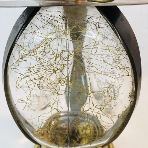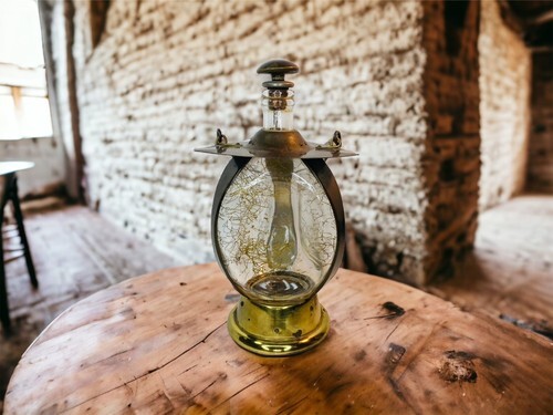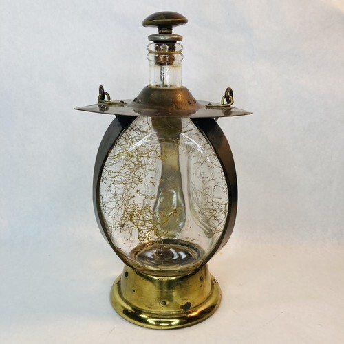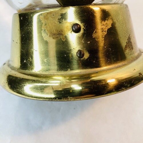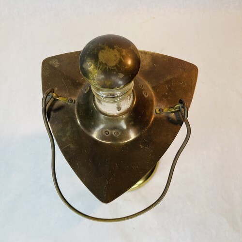 Super cool early Mid Century booze decanter lantern with a music box that plays ?How Dry I Am.? Vintage; 1910-1950, Japanese, Mid-Century Modern, lantern-style, liquor decanter with windup music mechanism in base. Condition: minor wear. Materials: brass/glass/copper. Great for a pub shed or man cave or for a lantern. Glass has cool retro squiggle designs in gold.