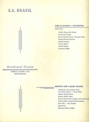 An S S Brazil Dinner Menu from a Northland Cruise on August 4, 1964 sailing of this Moore McCormack Ship. In very good condition. Measures about 8 3/4" x 11 3/4" when closed. This is Serial No. 3 in a series of very colorful menu covers. Depicts a Gaucho .