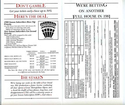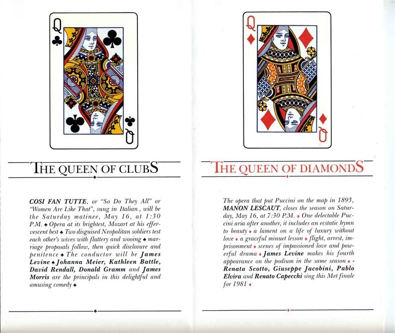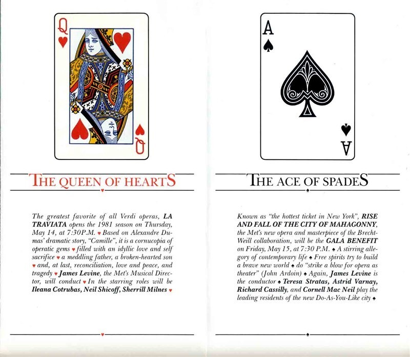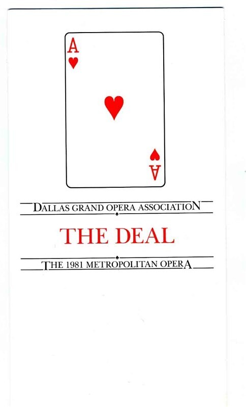 A colorful 14 panel fold out brochure, The Deal a listing of the 1981 Metropolitan Opera Schedule of performances with the Dallas Grand Opera Association. Has a Playing Card Face Card for each opera with details on the Opera, with conductor, singers, performance times and dates and more. Singers included Ileana Cotrubas, Teresa Stratas, Kathleen Battle and Renate Scotto. James Levine was the conductor. Includes a theatre diagram with seat and subscription prices and an application. Is blank on one side.