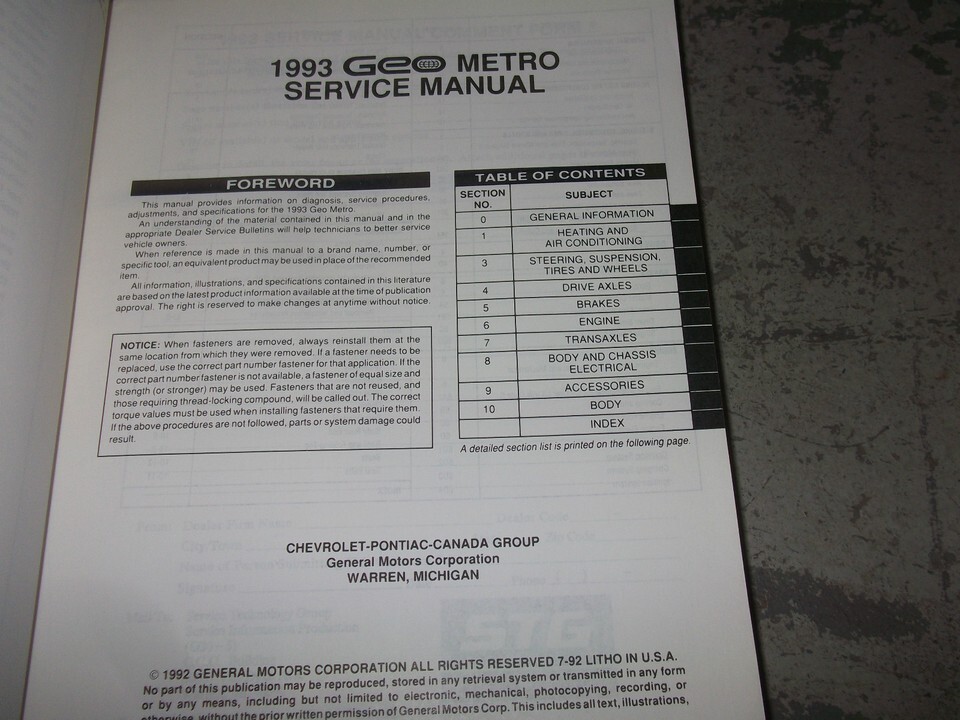 1993 Chevy Geo Metro Service Atelier and 50 similar items