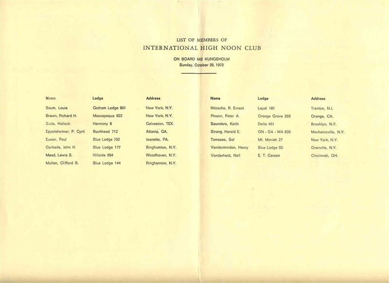 A 4 page program and record of a Meeting of Master Masons on board the Swedish American Line Motorliner Kungsholm on a Europe , Africa, South America, and West Indies Cruise on October 29, 1972. For the International High Noon Club which was founded on board the Former MS Kungsholm on February 22, 1929. has the name, lodge and address of each member in attendance. On the back cover are The Principles and Purposes of the International High Noon Club and the Minutes of the meeting.