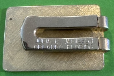 The product is a vintage money clip from the 40th Bob Hope Chrysler Classic Pro-Am golf tournament. It features an engraved Julia B Jamieson on the back, indicating that she was a contestant in the event. The money clip is made of silver and is of one size, making it a unique and collectible item for golf enthusiasts and fans of the Bob Hope Chrysler Classic.
