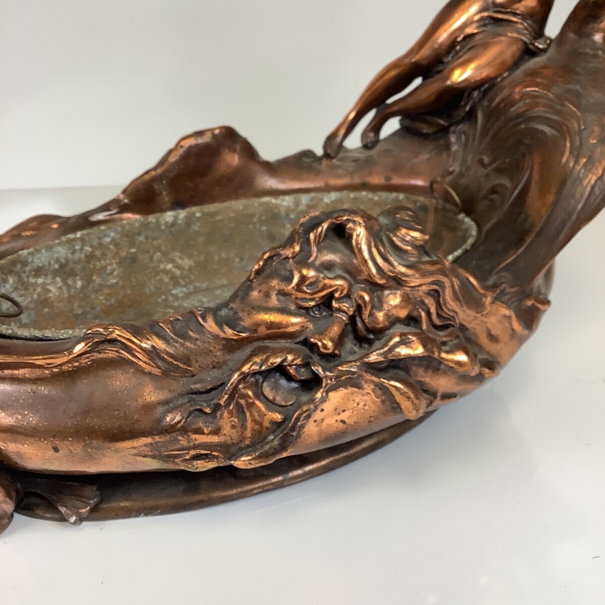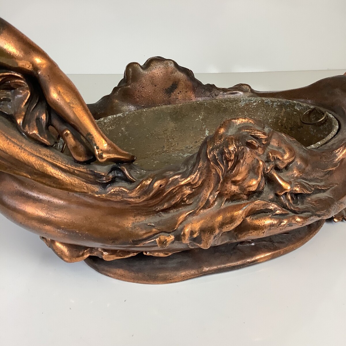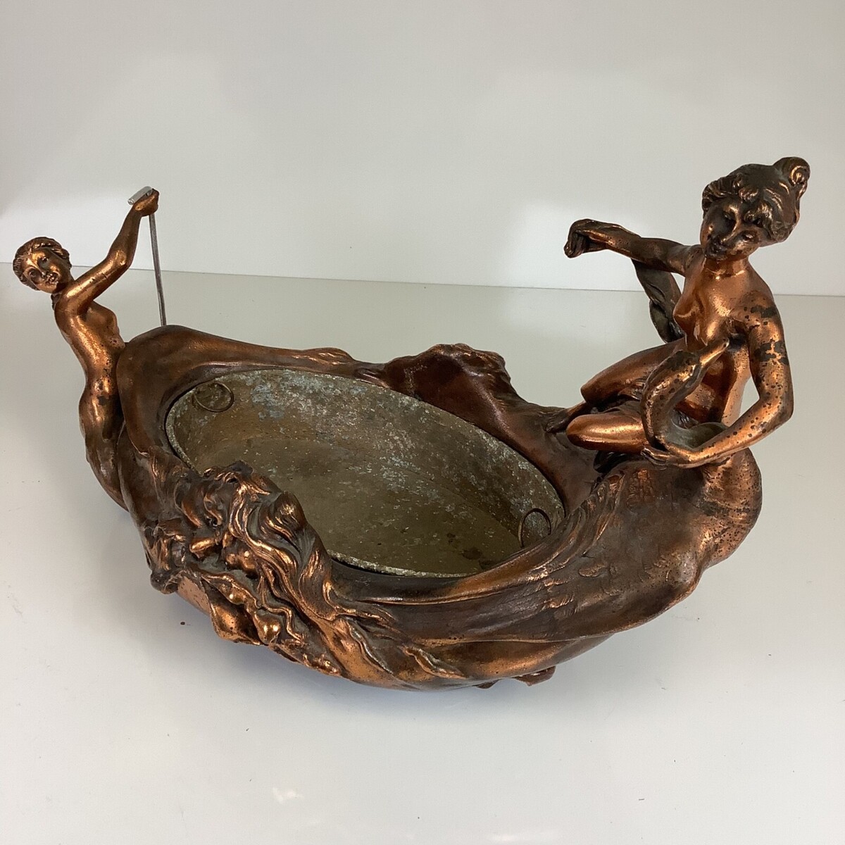 Very good antique condition with age-appropriate wear. The mermaid in back has what looks like a replacement oar made out of a gray metal. Overall atina appears original with expected surface variation. No obvious structural breaks noted. Please review all photos carefully as they form part of the description.